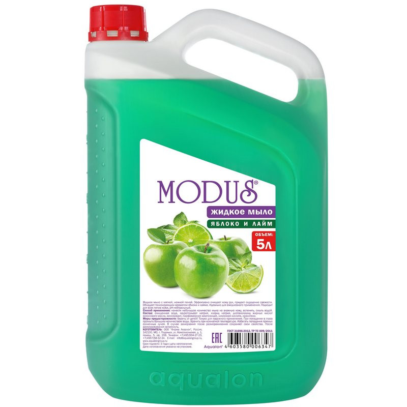 Мыло жидкое Modus Яблоко и лайм 5 л. Назначение: для мытья рук и тела. Способ применения: нанести небольшое количество мыла на влажную кожу, вспенить, смыть водой. Меры предосторожности: только для наружного применения. Беречь от детей. При попадании в глаза промыть большим количеством воды. При случайном употреблении внутрь немедленно обратиться к врачу, показав упаковку и этикетку. Состав: очищенная вода, лауретсульфат натрия (5-15%), хлорид натрия (< 5%), диэтаноламид жирных кислот кокосового масла (< 5%) консервант (< 1%), парфюмерная композиция (< 1%), лимонная кислота (< 1%), красители (< 1%). Условия хранения: хранить при комнатной температуре, избегать попадания прямых солнечных лучей. В случае замерзания после размораживания сохраняет свои свойства. После размораживания встряхнуть. Срок годности 3 года.<!--noindex-->Внешний вид и/или характеристики товара могут быть изменены производителем в соответствии с производственным процессом.<!--/noindex-->