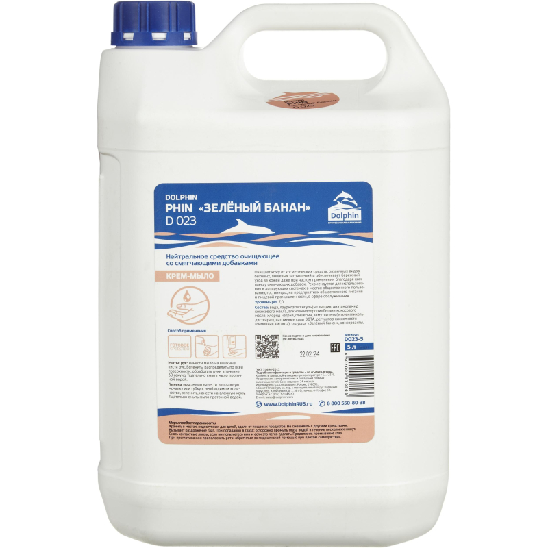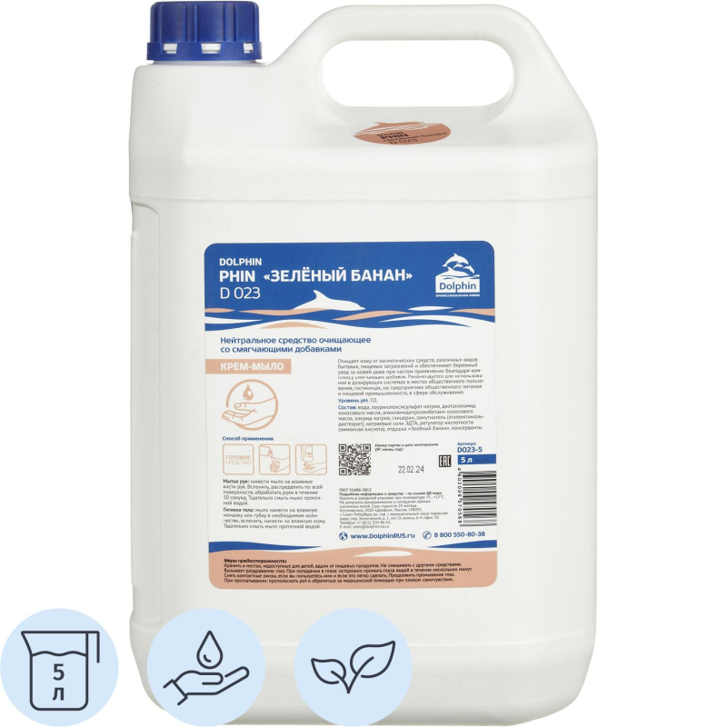 Нейтральное гель-мыло со смягчающими добавками Dolphin Phin D023 5 л. Назначение: для личной гигиены. Область применения: рекомендуется для использования в дозирующих системах в местах общественного пользования. Свойства: очищает кожу от различных видов бытовых загрязнений и косметических средств. Комплекс смягчающих добавок, входящий в состав средства, обеспечивает бережный уход за кожей, даже при частом применении. Способ применения: средство наносится на ладони, растирается до образования пены, тщательно смывается водой. Состав: вода, лаурилэтоксисульфат натрия, диэтаноламид кокосового масла, алкиламидопропилбетаин кокосового масла, хлорид натрия, глицерин, замутнитель (этиленгликольдистеарат), натриевые соли ЭДТА, регулятор кислотности (лимонная кислота), отдушка (Зеленый банан), консерванты (CMIT/MIT). Плотность: 1.03 грамм на кубический сантиметр. Значение pH 1%-раствора: 7. Меры предосторожности (подробная информация см. паспорт безопасности): не смешивать с другими средствами, перед применением прочесть инструкцию. При попадании в глаза промыть большим количеством воды, при необходимости обратиться к врачу. Условия хранения: хранить в заводской упаковке при температуре 5-25 градусов Цельсия. Не допускать замораживания и попадания прямых солнечных лучей. Хранить в местах недоступных для детей, вдали от пищевых продуктов. Срок годности: 24 месяца (с даты производства). <!--noindex-->Внешний вид и/или характеристики товара могут быть изменены производителем в соответствии с производственным процессом.<!--/noindex-->