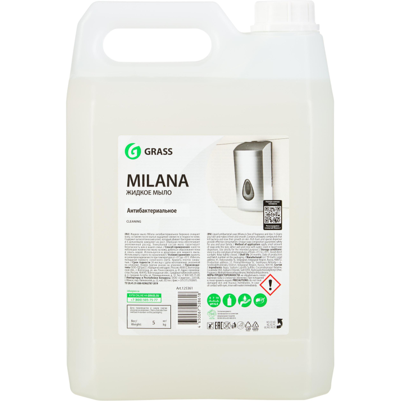 Мыло жидкое Grass Milana Антибактериальное 5 л. Жидкое мыло Milana антибактериальное бережно очищает кожу, оставляя после мытья ощущение свежести и гладкости кожи. Содержит антисептический агент, который убивает бактерии на коже и в дальнейшнем замедляет их рост. Обильная пена обеспечивают экономичный расход. Профессиональное средство, не содержит красителей и ароматизаторов. Состав: aqua, Sodium Laureth Sulfate, Cocamidopropyl Betaine, Cocamide DEA, Sodium Chloride, Fragrance, salt EDTA, Triclosan, Citric Acid, Methylchloroisothiazolinone, Methylisothiazolinone. Способ применения: нанести небольшое количество мыла на кожу, добиться образования пены и смыть водой. Используется в дозаторах жидкого мыла.<!--noindex-->Внешний вид и/или характеристики товара могут быть изменены производителем в соответствии с производственным процессом.<!--/noindex-->