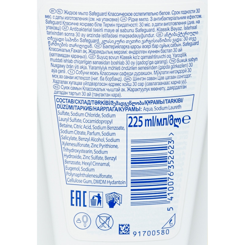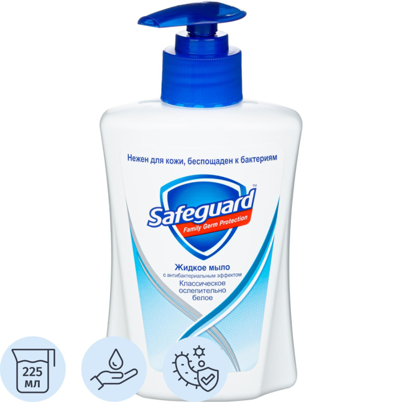 Мыло жидкое Safeguard Ослепительно белое антибактериальное 225 мл. Назначение: средство для антибактериальной гигиены рук. Способ применения: вымойте руки жидким мылом, затем тщательно сполосните водой. Меры предосторожности: не использовать для детей в возрасте до трех лет. Состав: вода, талловат натрия, гипофосфит натрия, натрий пальмитат, глицерин, ароматизатор, триклокарбан, лимонная кислота, цитрат натрия, хлорид натрия, пальмоядровая кислота, пентанатрия пентенат, тетранатрия этидронат, бензиловый салицилат, гексилциннамаль, красители CI77891, CI 14700, CI 47005. Условия хранения: хранить в сухом, прохладном месте. Избегать попадания прямых солнечных лучей. Срок годности 2 года. <!--noindex-->Внешний вид и/или характеристики товара могут быть изменены производителем в соответствии с производственным процессом.<!--/noindex-->