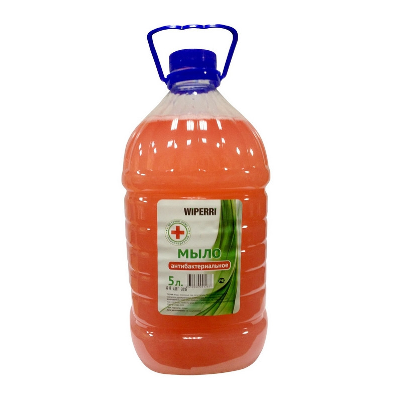 Жидкое мыло Wiperri Антибактериальное 5 л. Назначение: мыло жидкое антибактериальное для мытья рук. Способ применения: небольшое количество средства нанести на смоченную водой кожу, помассировать, смыть водой. Меры предосторожности: при попадании средства в глаза промыть большим количеством воды. Состав: вода, анионные пав, загуститель, триклозан, консервант, краситель, ароматическая композиция, модификатор pH. Условия хранения: хранить в недоступном для детей месте отдельно от пищевых продуктов. Срок годности: 36 месяцев.
