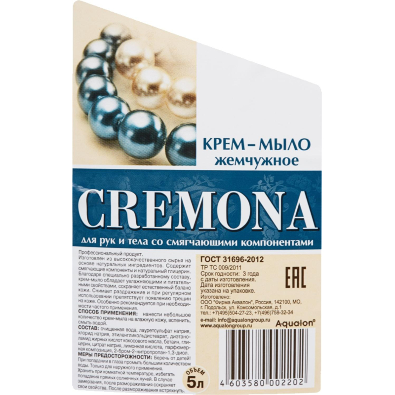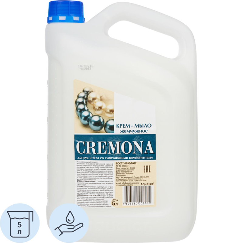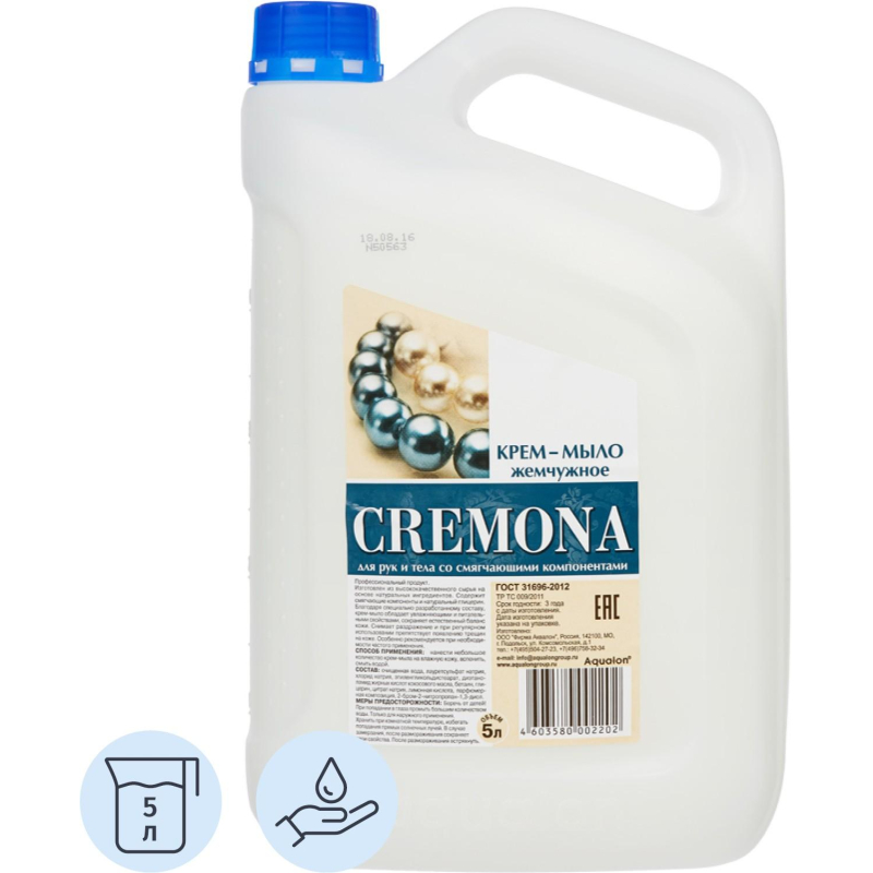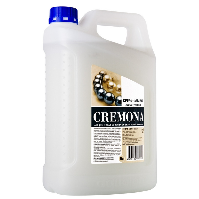 Мыло жидкое Кремона Жемчужное 5 л. Назначение: крем-мыло класса 'premium', изготовлено из высококачественного сырья на основе натуральных ингредиентов. Благодаря специально разработанному составу обладает питательными и смягчающими свойствами для кожи, содержит натуральный глицерин. Снимает раздражение и при регулярном использовании препятствует появлению трещин на коже. Профессиональный продукт. Легко пенится и бережно очищает кожу рук и тела. Оказывает питательное воздействие и увлажняет кожу, рН-нейтральный, - Перламутровая рецептура, - Упаковывается в канистры и предназначено для профессионального использования (клининг, HoReCа). Способ применения: нанести небольшое количество мыла на влажную кожу, вспенить, смыть водой. Меры предосторожности: только для наружного применения. Беречь от детей. При попадании в глаза промыть большим количеством воды. При случайном употреблении внутрь немедленно обратиться к врачу, показав упаковку и этикетку. Состав: очищенная вода, лауретсульфат натрия (5-10%), хлорид натрия (< 5%), этиленгликольдистеарат (< 5%), диэтаноламид жирных кислот кокосового масла (< 5%), бетаин (< 5%), глицерин (< 5%), цитрат натрия (< 5%), лимонная кислота (< 5%), парфюмерная композиция (< 1%), 2-бром-2-нитропропан-1.3-диол (< 1%)Условия хранения: хранить при комнатной температуре. Избегать попадания прямых солнечных лучей. В случае замерзания, после размораживания сохраняет свои свойства. После размораживания встряхнуть. Срок годности: 3 года.<!--noindex-->Внешний вид и/или характеристики товара могут быть изменены производителем в соответствии с производственным процессом.<!--/noindex-->