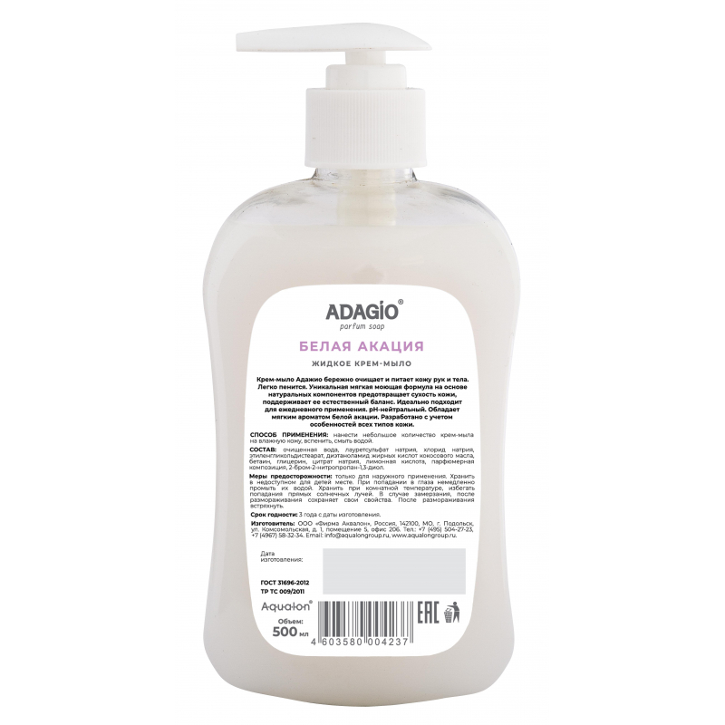 Мыло жидкое Адажио Белая акация 500 мл. Назначение: крем-мыло класса 'premium', изготовлено из высококачественного сырья на основе натуральных ингредиентов. Смягчает и питает кожу рук, обладает комплексом увлажняющих компонентов. Перламутровая рецептура. Легкие, приятные ароматы. Благодаря мягкой моющей основе с активными веществами, мыло идеально подходит для ежедневного применения. Профессиональный продукт. Легко пенится и бережно очищает. Предназначено для частого применения, рН - нейтральный. Оказывает питательное и увлажняющее воздействие. Перламутровая рецептура. Способ применения: нанести небольшое количество мыла на влажную кожу, вспенить, смыть водой. Меры предосторожности: только для наружного применения. Беречь от детей. При попадании в глаза промыть большим количеством воды. При случайном употреблении внутрь немедленно обратиться к врачу, показав упаковку и этикетку. Состав: очищенная вода, лауретсульфат натрия (5-10%), хлорид натрия (< 5%), этиленгликольдистеарат (< 5%), диэтаноламид жирных кислот кокосового масла (< 5%), бетаин (< 5%), глицерин (< 5%), цитрат натрия (< 5%), лимонная кислота (< 5%), парфюмерная композиция (< 1%), 2-бром-2-нитропропан-1.3-диол (< 1%) Условия хранения: хранить при комнатной температуре. Избегать попадания прямых солнечных лучей. В случае замерзания, после размораживания сохраняет свои свойства. После размораживания встряхнуть. Срок годности: 3 года.<!--noindex-->Внешний вид и/или характеристики товара могут быть изменены производителем в соответствии с производственным процессом.<!--/noindex-->