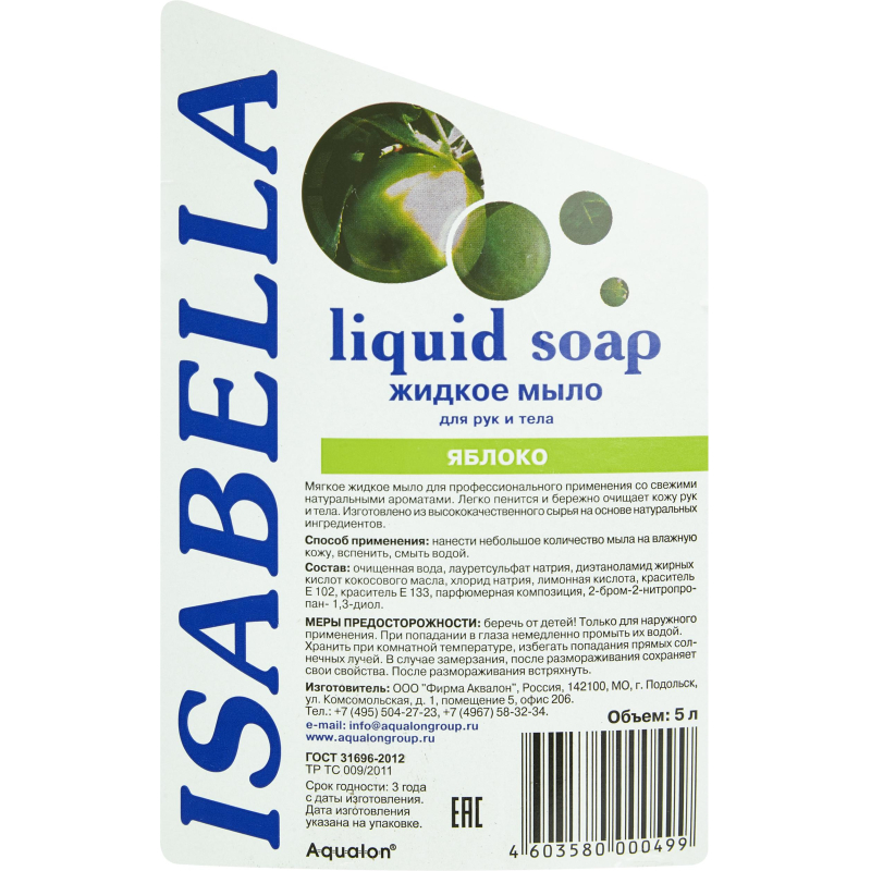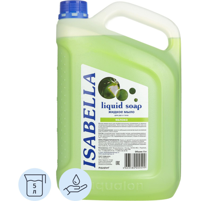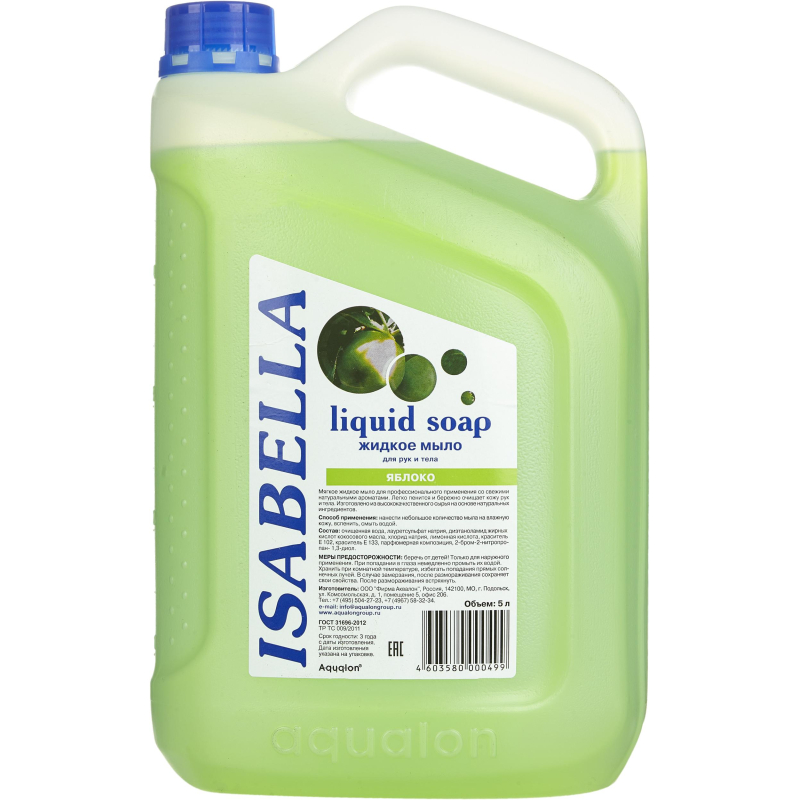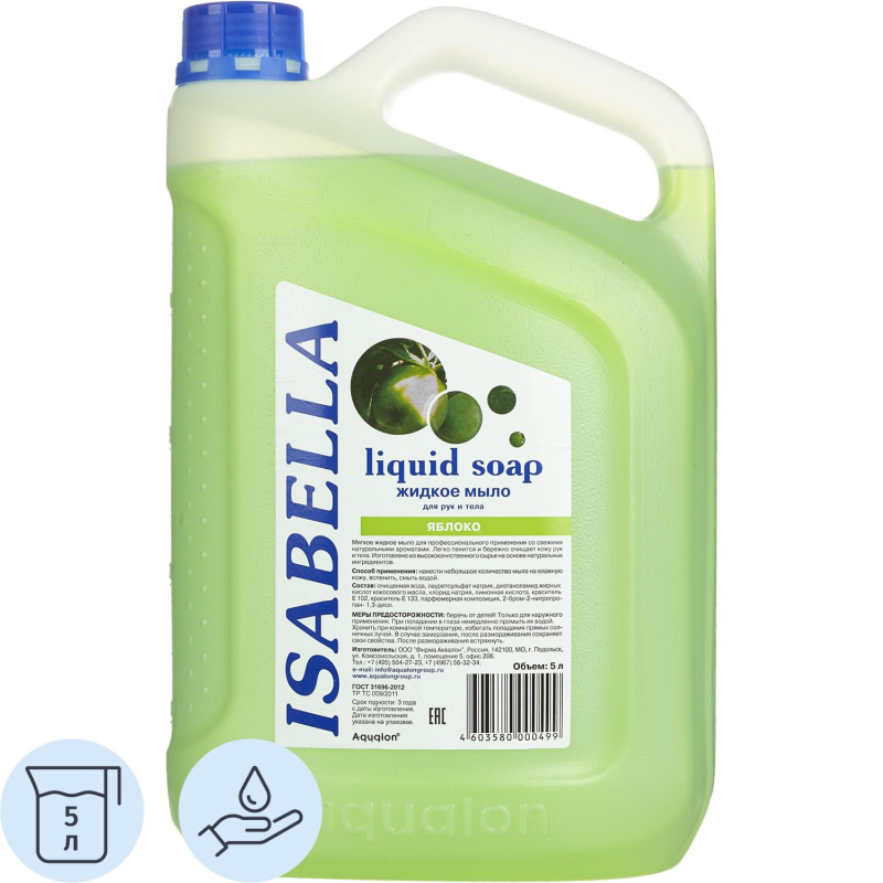 Мыло жидкое Изабелла Яблоко 5 л. Назначение: мягкое жидкое мыло для профессионального применения со свежим ароматом яблока. Легко пенится, бережно очищает кожу рук и тела. Изготовлено из высококачественного сырья на основе натуральных компонентов. Профессиональный продукт. Легко пенится и бережно очищает, pH - нейтрально. Подходит для всех типов кожи. Рекомендовано для частого применения. Упаковывается в канистры и предназначено для профессионального применения (клининг, HoReCa). Способ применения: нанести небольшое количество мыла на влажную кожу, вспенить, смыть водой. Меры предосторожности: только для наружного применения. Беречь от детей. При попадании в глаза промыть большим количеством воды. При случайном употреблении внутрь немедленно обратиться к врачу, показав упаковку и этикетку. Состав: очищенная вода, лауретсульфат натрия (5-10%), диэтаноламид жирных кислот кокосового масла (<5%), хлорид натрия (<5%), лимонная кислота (<5%), красители (<1%), парфюмерная композиция (<1%), 2-бром-2-нитропропан-1.3-диол (<1%). Условия хранения: хранить при комнатной температуре. Избегать попадания прямых солнечных лучей. В случае замерзания, после размораживания сохраняет свои свойства. После размораживания встряхнуть. Срок годности: 3 года. <!--noindex-->Внешний вид и/или характеристики товара могут быть изменены производителем в соответствии с производственным процессом.<!--/noindex-->