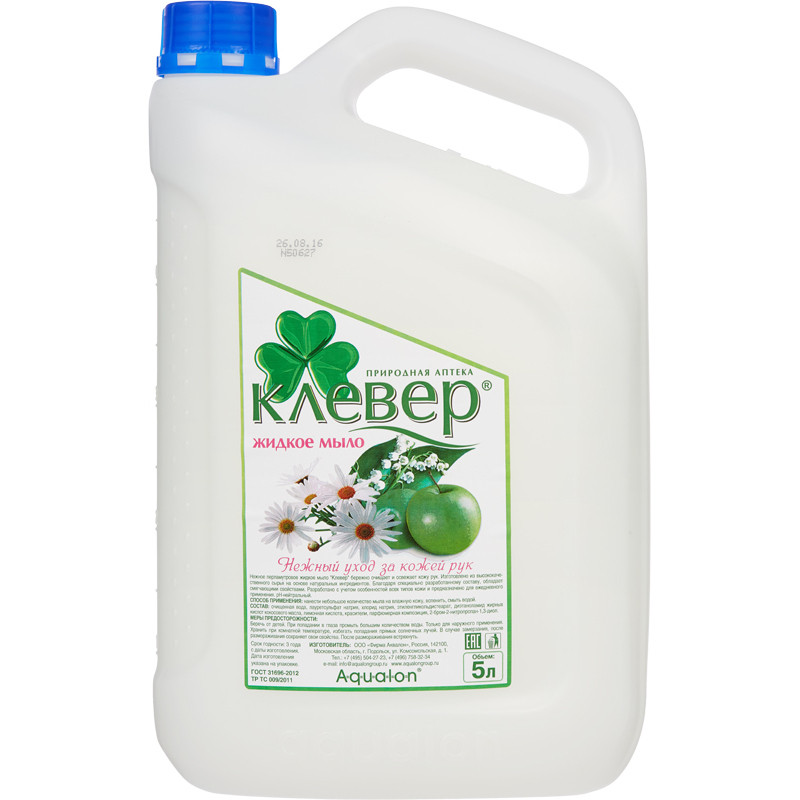 Мыло жидкое Клевер Перламутровое ландыш 5 л. Назначение: для мытья рук и тела. Способ применения: нанести небольшое количество мыла на влажную кожу, вспенить, смыть водой. Меры предосторожности: только для наружного применения. Беречь от детей. При попадании в глаза промыть большим количеством воды. При случайном употреблении внутрь немедленно обратиться к врачу, показав упаковку и этикетку. Состав: очищенная вода, лауретсульфат натрия (5-15%), хлорид натрия (< 5%), этиленгликольдистеарат (< 5%), диэтаноламид жирных кислот кокосового масла (< 5%), лимонная кислота (< 5%), парфюмерная композиция (< 1%), 2-бром-2-нитропропан-1.3-диол(< 1%), показатель pH 5,5 - 8.5. Условия хранения: Хранить при комнатной температуре, избегать попадания прямых солнечных лучей. Срок годности: 3 года. <!--noindex-->Внешний вид и/или характеристики товара могут быть изменены производителем в соответствии с производственным процессом.<!--/noindex-->