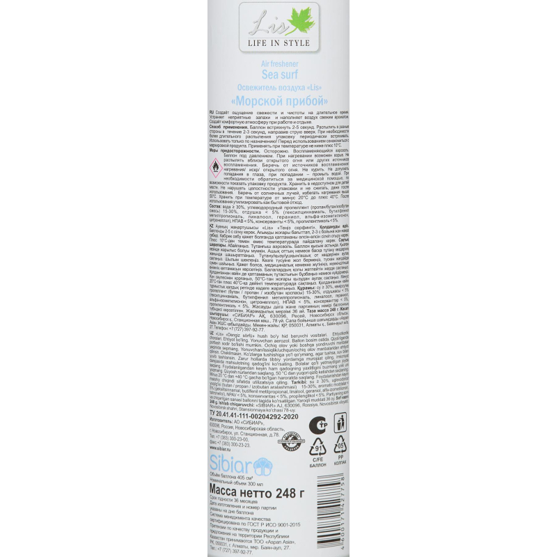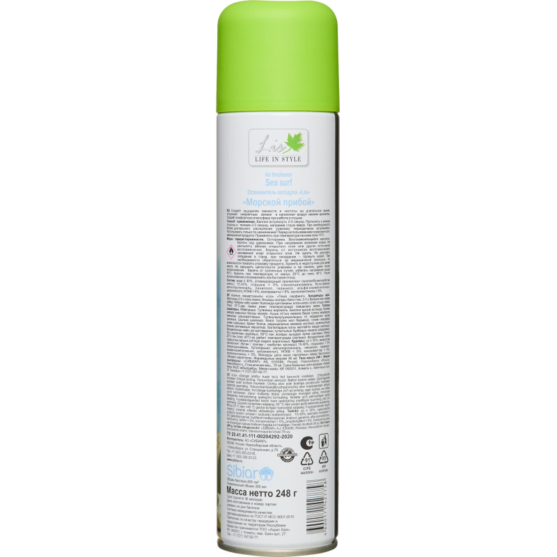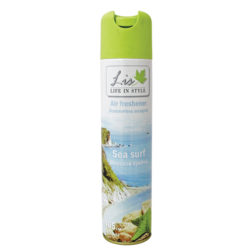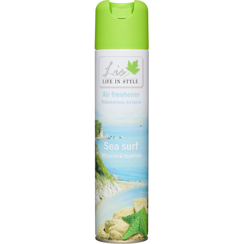 Освежитель воздуха Lis Морской прибой 300 мл. Назначение/особенности: создает ощущение свежести и чистоты на длительное время. Устраняет неприятные запахи и наполняет воздух свежим ароматом. Создает комфортную атмосферу при работе и отдыхе. Высокая эффективность и стойкий аромат для контроля неприятных запахов. Подходит для туалетных комнат площадью до 20 кв.м. Способ применения: хорошо встряхнуть баллон несколько раз, нажать на клапан и в течение нескольких секунд распылить освежитель в воздух, направив струю аэрозоля вверх и в разные стороны. Внимание! При распылении следует избегать попадания аэрозоля на стены и на предметы интерьера. Баллон при распылении не переворачивать! Меры предосторожности: использовать только по назначению! Осторожно! Воспламеняется! Не распылять вблизи открытого огня и раскаленных предметов! Предохранять от воздействия прямых солнечных лучей и нагревания выше +40 °C! Баллон под давлением! Не вскрывать и не сжигать баллон даже после использования! Не допускать попадания в глаза! При попадании в глаза немедленно промыть их чистой водой! При необходимости обратиться к врачу! Избегать попадания на кожу! Не вдыхать! Не глотать! Беречь от детей! Состав: вода, бутан/пропан/изобутан смесь 15%-30%, отдушка <5%, сорбитанолеат <5%, метилизотиазолинон (и) хлорметилизотиазолинон <5%, триэтиленгликоль <5%, нитрит натрия <5%. Условия хранения: хранить отдельно от пищевых продуктов в сухом прохладном месте, недоступном для детей. После использования утилизировать как бытовой отход. Срок годности: 36 месяцев. Относится к сегменту ?суперэконом? - товар с минимальными требованиями к качеству для тех, кто хочет сэкономить. Товар отвечает основным потребительским характеристикам.