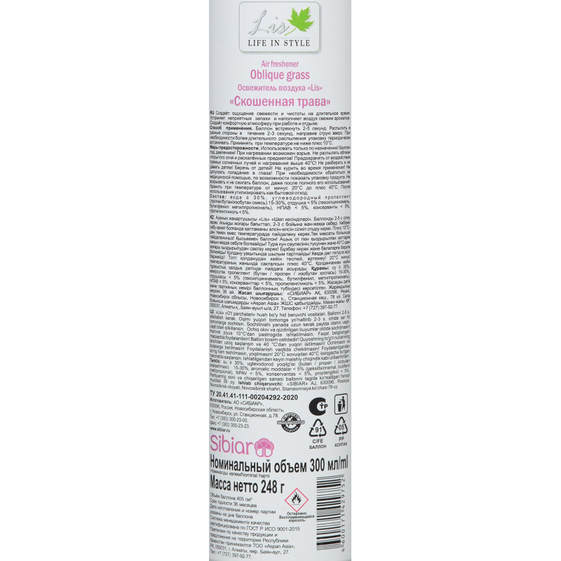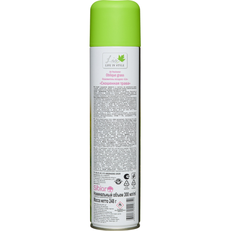 Освежитель воздуха LIS Скошенная Трава 300 мл.Назначение: Создает ощущение свежести и чистоты на длительное время. Устраняет неприятные запахи и наполняет воздух свежим ароматом. Создает комфортную атмосферу при работе и отдыхе.Способ применения: Баллон встряхнуть 2-5 секунд. Распылить в разные стороны в течении 2-3 секунд, направив струю вверх. При необходимости более длительного распыления упаковку переодически встряхивать. Применять при температуре не ниже +10 °С.Меры предосторожности: Баллон под давлением! Не распылять вблизи открытого огня и раскаленных предметов! Предохранять от воздействия прямых солнечных лучей и нагревания выше 40 °С! Не разбирать и не давать детям! Не курить во время применения! Не допускать попадания в глаза! Не вскрывать и не сжигать баллон, даже после полного его использования!Условия хранения:Хранить при температуре от минус 20 °С до плюс 40 °С. После использования утилизировать как бытовой отход.Состав: Вода, бутан/пропан/изобутан смесь 15-30%, отдушка <5%, сорбитан олеат <5%, метилизотиазолинон (и) хлорметилизотиазолинон<5%, триэтиленгликоль <5%, нитрит натрия <5%.Срок годности 36 месяцев. Относится к сегменту 'суперэконом' - товар с минимальными требованиями к качеству для тех, кто хочет сэкономить. Товар отвечает основным потребительским характеристикам.