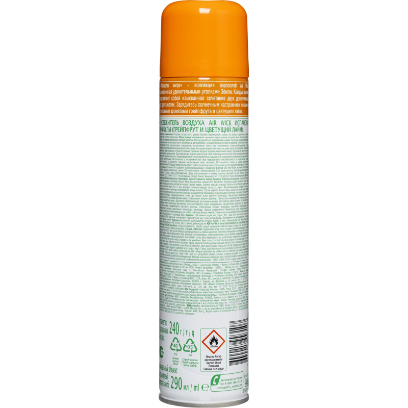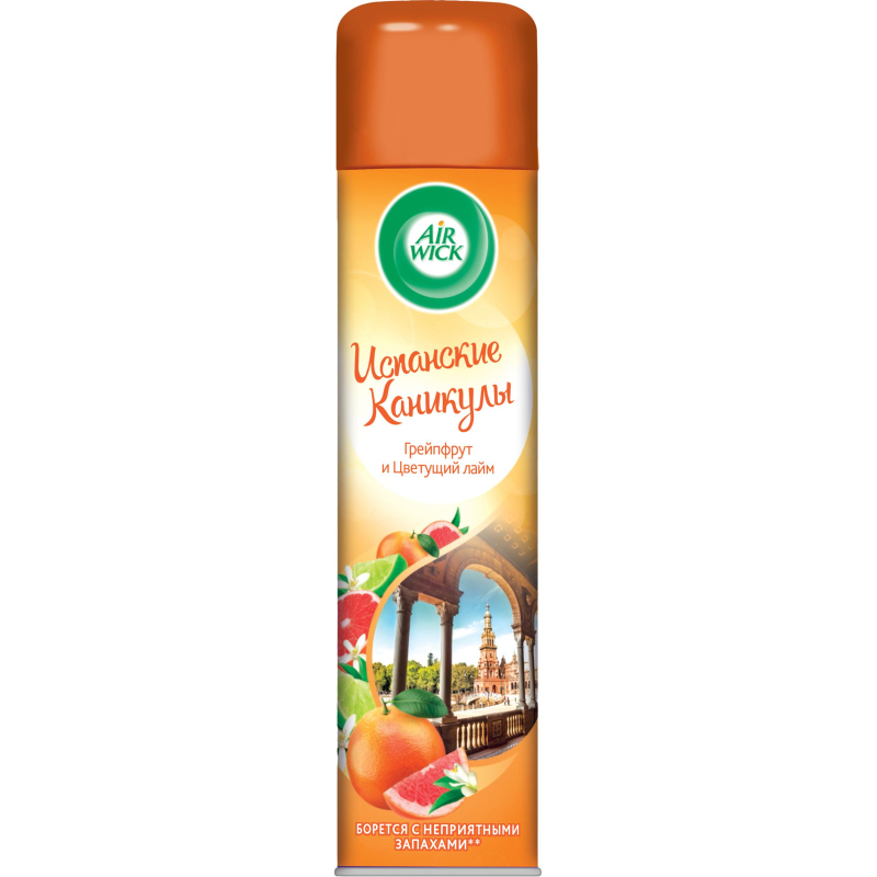 Освежитель воздуха Air Wick Испанские каникулы 290 мл. Назначение/особенности: аэрозоль-освежитель воздуха Air Wick ?Испанские каникулы? из новой коллекции Ароматы мира эффективно борется с неприятными запахами, создавая заряд солнечного настроения Испании с цитрусовыми ароматами грейпфрута и цветущего лайма. Изготовлено в соответствии с ГОСТ 32481-2013. Способ применения: хорошо встряхнуть, держа баллон вертикально, нажать на клапан и распылить содержимое баллона от себя к центру помещения. Меры предосторожности: прочитать внимательно этикетку перед использованием. Хранить в недоступном для детей и животных месте. Использовать с осторожностью при повышенной чувствительности к парфюмерным отдушкам (запахам). Освежители воздуха не являются заменой надлежащих мер гигиены. Использовать только в хорошо проветриваемых помещениях. Может вызывать аллергическую реакцию. Меры предосторожности: Баллон находится под давлением. При нагревании возможен разрыв баллона. Предохранять от воздействия прямых солнечных лучей и нагревания выше 50°С. Экстремальные температуры могут возникать в автомобилях, а также вблизи духовок и каминов. Огнеопасно! Не распылять вблизи открытого огня, раскаленных предметов, источников тепла или включенного электрооборудования. Не курить в помещении при использовании аэрозольного баллона. Не прокалывать и не сжигать даже после использования. Не разбирать и не давать детям. При попадании в глаза осторожно промыть водой в течение нескольких минут. При наличии удалить контактные линзы и продолжить промывание. При обращении к врачу иметь при себе упаковку или этикетку. Использовать только по прямому назначению. Не вдыхать аэрозоль. Преднамеренное злоупотребление вдыханием содержимого освежителя воздуха может быть вредным или смертельным. Внимание! Твердая поверхность может стать скользкой при попадании на нее освежителя воздуха. Утилизировать вместе с бытовыми отходами. Не содержит озоноразрушающих веществ. Состав: 15% или более, но менее 30% пропеллент (смесь бутана, пропана, изобутана); менее 5% консервант, неионогенные ПАВ, ароматизатор, линалоол. Условия хранения: хранить в недоступном для детей и животных месте. Срок годности: 24 месяца с даты изготовления (дату изготовления см. на упаковке).