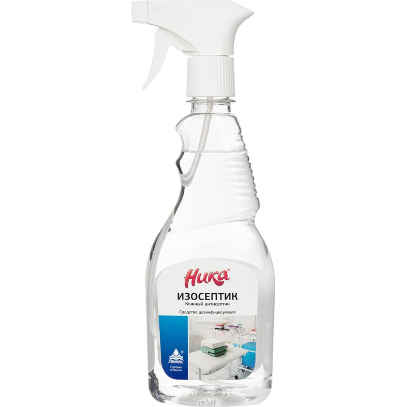 Антисептик кожный Ника Изосептик 500 мл. Назначение: кожный антисептик Ника Изосептик предназначен для гигиенической обработки рук, экспресс-дезинфекции и очистки различных твердых непористых поверхностей, предметов в том числе, загрязненных кровью, дезинфекции обуви.Способ применения: - Гигиеническая обработка рук: 3 мл - 30 секунд. - Экспресс-дезинфекция поверхностей, оборудования: при бактериальной инфекции - 30 секунд; при туберкулезе, вирусной, грибковой инфекции - З минуты. Антимикробная активность: бактерии (включая возбудителей кишечных инфекций), туберкулез, вирусы (ОРВИ, гепатиты всех видов, герпес), дрожжеподобные грибы. Разрешено на предприятиях общественного питания, пищевой промышленности, в лечебно-профилактических, детских школьных и дошкольных учреждениях, на объектах сферы обслуживания и в быту населением. Утверждено к применению Роспотребнадзором. Соответствует санитарным нормам.Состав: изопропиловый спирт 65%, ЧАС 0.2%, функциональные добавки, увлажняющие компоненты.Срок годности: 3 года с момента производства (при соблюдении условий хранения, рекомендованных производителем). Законодательные и технические документы: