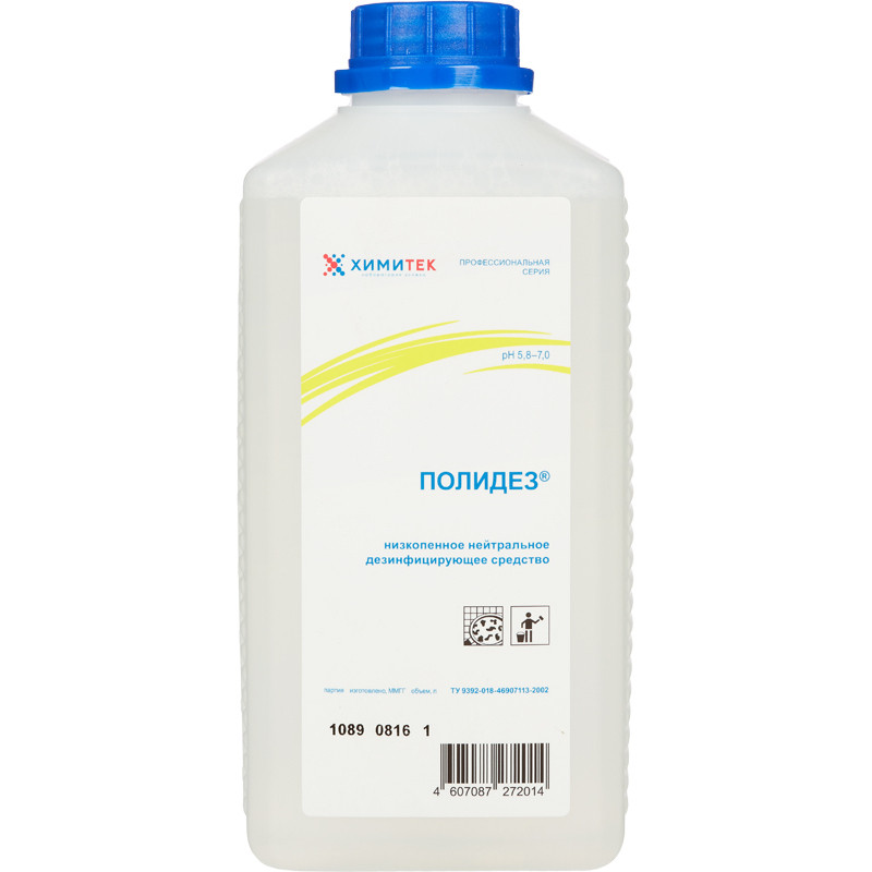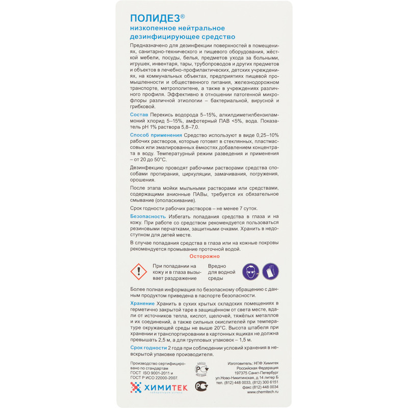 Концентрированное жидкое низкопенное нейтральное дезинфицирующее средство Химитек Полидез Назначение: Предназначено для дезинфекции поверхностей в помещениях, санитарно-технического и пищевого оборудования, жесткой мебели, посуды, белья, предметов ухода за больными, игрушек, инвентаря, тары, трубопроводов и других предметов и объектов в лечебно-профилактических, детских учреждениях, на коммунальных объектах, предприятиях пищевой промышленности и общественного питания, железнодорожном транспорте, метрополитене, а также в учреждениях различного профиля. Эффективно в отношении патогенной микрофлоры различной этиологии - бактериальной, вирусной и грибковой. Способ применения: Средство используют в виде 0,25%-10% рабочих растворов, которые готовят в стеклянных, пластмассовых или эмалированных емкостях добавлением концентрата в воду. Температурный режим разведения и применения - от 20°C до 50°C. Дезинфекцию проводят рабочими растворами средства способами протирания, циркуляции, замачивания, погружения, орошения. После этапа мойки мыльными растворами или средствами, содержащими анионные ПАВы, требуется их обязательное смывание (ополаскивание). Срок хранения растворов - не менее 7 суток. Меры предосторожности: Избегать попадания средства в глаза и на кожу. При работе со средством рекомендуется пользоваться резиновыми перчатками, защитными очками. Хранить в недоступном для детей месте. В случае попадания средства в глаза или на кожные покровы рекомендуется промывание проточной водой. Условия хранения:Хранить в сухих крытых складских помещениях в герметично закрытой таре в защищенном от света месте, вдали от источников тепла, кислот, щелочей, тяжелых металлов и их соединений, а также сильных окислителей при температуре окружающей среды не выше +20 °C. Состав: Вода 30%, перекись водорода 5%, но <15%, алкилдиметилбензиламмоний хлорид 5%, но <15%, амфотерный ПАВ<5%. Срок годности: 2 года при соблюдении условий хранения в невскрытой упаковке производителя.