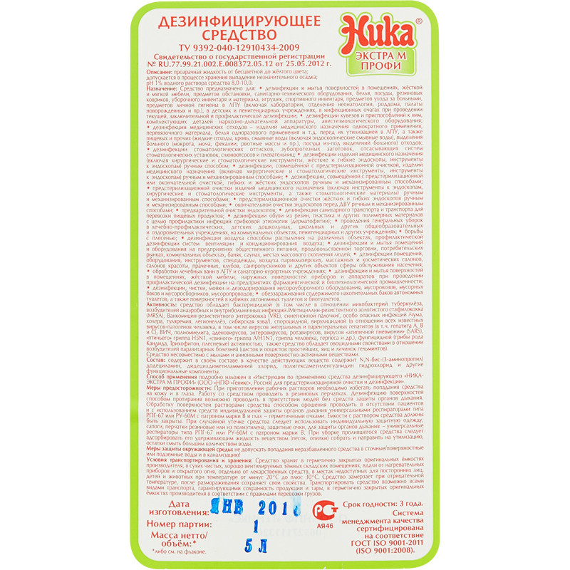 Дезинфицирующее средство Ника-Экстра М ПрофиНазначение:Средство предназначено для:-дезинфекции и мытья поверхностей в помещениях, жесткой и мягкой мебели, напольных покрытий и обивочных тканей, предметов обстановки, поверхностей аппаратов, приборов, санитарно-технического оборудования, белья, посуды (в том числе одноразовой и лабораторной), предметов для мытья посуды, резиновых и полипропиленовых ковриков, уборочного инвентаря и материала, игрушек, спортивного инвентаря, предметов ухода за больными, предметов личной гигиены в ЛПУ любого профиля (включая клинические, диагностические и бактериологические лаборатории, отделения неонатологии, роддома, палаты новорожденных и пр.), в детских и пенитенциарных учреждениях, в инфекционных очагах при проведении текущей, заключительной и профилактической дезинфекции;-дезинфекции кувезов и приспособлений к ним, комплектующих деталей наркозно-дыхательной аппаратуры, анестезиологического оборудования;-для дезинфекции медицинских отходов -изделий медицинского назначения однократного применения, перевязочного материала, белья одноразового применения и т.д. перед их утилизацией в ЛПУ, а также пищевых и прочих (жидкие отходы, кровь, смывные воды (включая эндоскопические смывные воды), выделения больного (мокрота, моча, фекалии, рвотные массы и пр.), посуда из-под выделений больного) отходов;-дезинфекции стоматологических оттисков из альгинатных, силиконовых материалов, полиэфирной смолы, зубопротезных заготовок из металлов, керамики, пластмасс и других материалов, отсасывающих систем стоматологических установок, слюноотсосов и плевательниц;-дезинфекции изделий медицинского назначения (включая хирургические и стоматологические инструменты, в том числе вращающиеся, жесткие и гибкие эндоскопы, инструменты к эндоскопам) ручным способом;-дезинфекции, совмещенной с предстерилизационной очисткой, изделий медицинского назначения (включая хирургические и стоматологические инструменты, в том числе вращающиеся, инструменты к эндоскопам) ручным и механизированным (в ультразвуковых установках любого типа) способами;-дезинфекции, совмещенной с предстерилизационной или окончательной (перед дезинфекцией высокого уровня /ДВУ/) очисткой, гибких и жесткихэндоскопов ручным и механизированным (в специализированных установках, например, 'КРОНТ-УДЭ') способами;-предстерилизационной очистки, не совмещенной с дезинфекцией, изделий медицинского назначения (включая инструменты к эндоскопам, хирургические и стоматологические инструменты, в том числе вращающиеся, а также стоматологические материалы) ручным и механизированным (в ультразвуковых установках любого типа) способами;-предстерилизационной очистки, не совмещенной с дезинфекцией, жестких и гибких эндоскопов ручным и механизированным (в специализированных установках, например, 'КРОНТ-УДЭ') способами;-окончательной очистки эндоскопов перед ДВУ ручным и механизированным (в специализированных установках, например, 'КРОНТ-УДЭ') способами;-предварительной очистки эндоскопов;-дезинфекции санитарного транспорта и транспорта для перевозки пищевых продуктов;-дезинфекции обуви из резин, пластика и других полимерных материалов с целью профилактики инфекций грибковой этиологии (дерматофитии);-для использования в дезинфицирующих коври