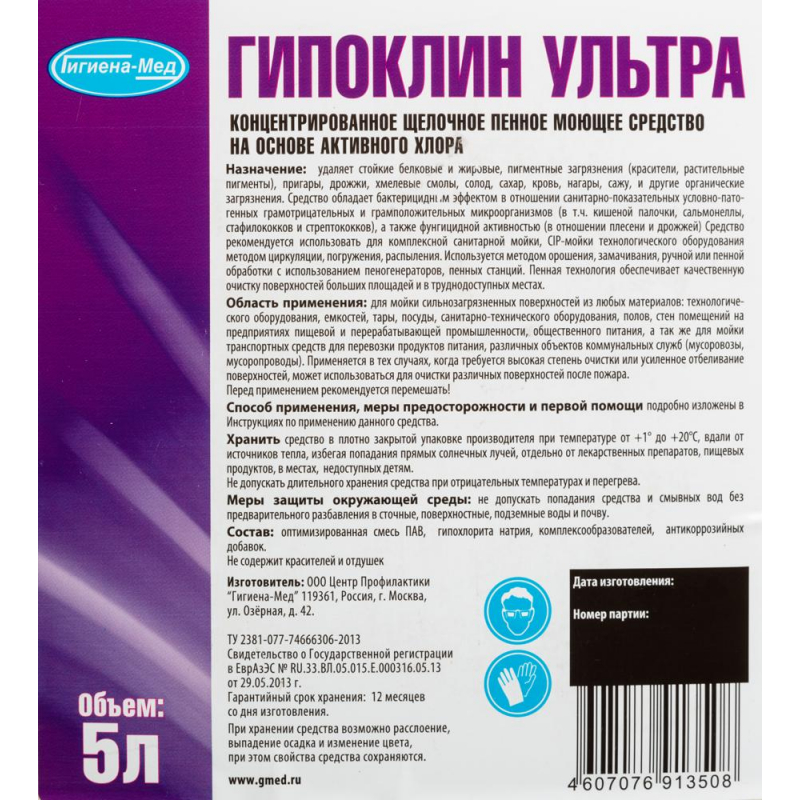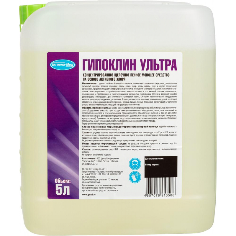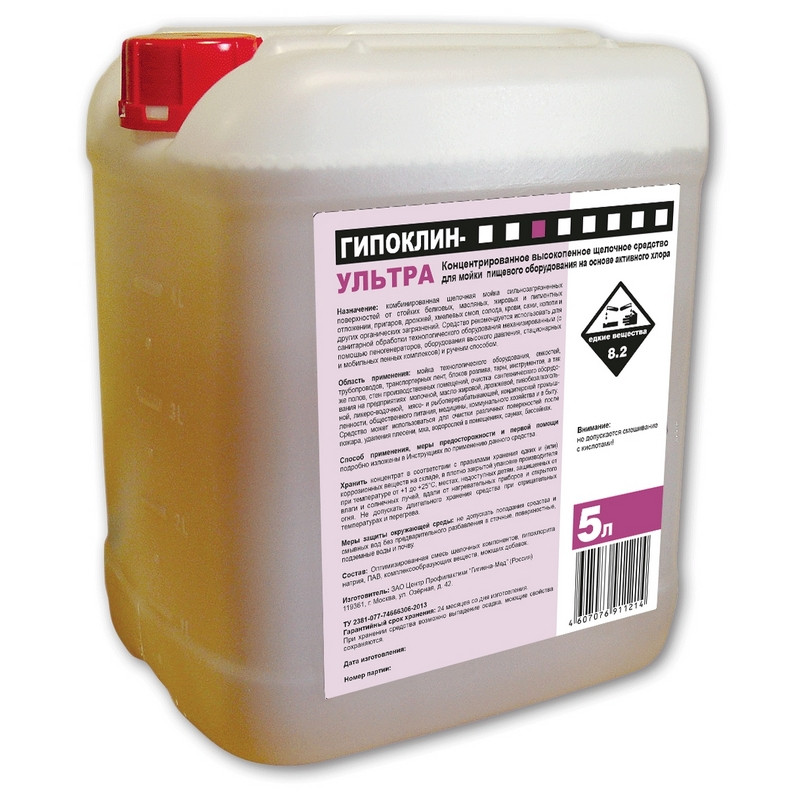 Концентрированное высокопенное щелочное средство для мойки пищевого оборудования Гипоклин Ультра<br><b>Назначение: </b><br>Средство предназначено для мойки сильнозагрязненных поверхностей из любых материалов: технологического оборудования, емкостей, тары, посуды, санитарно-технического оборудования, полов, стен помещений на предприятиях пищевой и перерабатывающей промышленности, общественного питания, а также для мойки транспортных средств для перевозки продуктов питания, различных объектов коммунальных служб (мусоровозы, мусоропроводы). Обладает моющим, обезжиривающим, отбеливающим и обеззараживающим действием, хорошо удаляет углеродистые и пигментные загрязнения (сажу, копоть, кровь), белковые загрязнения, жиры, животные и растительные масла и другие органические загрязнения, работает в воде любой жесткости, в холодной воде. Применяется в тех случаях, когда требуется высокая степень очистки или усиленное отбеливание поверхностей, может использоваться для очистки различных поверхностей после пожара.<br><b>Способ применения:</b><br>Для мойки поверхностей рекомендуется использовать рабочий раствор с концентрацией 0,2%-4,0%. Концентрация рабочего раствора зависит от характера и степени загрязненности поверхности, типа оборудования и метода применения. Температура воды, используемая для приготовления рабочего раствора - 20°C-70°C.<br><b>Меры предосторожности: </b><br>При попадании средства в глаза или на кожу немедленно промыть большим количеством воды. При необходимости обратиться за медицинской помощью.<br>Хранить в недоступном для детей месте.<br><b>Состав: </b><br>Едкий натрий, оптимизированная смесь ПАВ, пенных добавок и комплексообразующих веществ, гипохлорит натрия (не менее 6% активного хлора).<br><b>Условия хранения: </b><br>Хранить в закрытом вентилируемом складском помещении в оригинальных емкостях производителя при температуре от +1°C до +20°C, вдали от источников тепла, избегая попадания прямых солнечных лучей, отдельно от лекарственных препаратов, пищевых продуктов.<br><b>Срок годности: </b> 12 месяцев с даты изготовления.