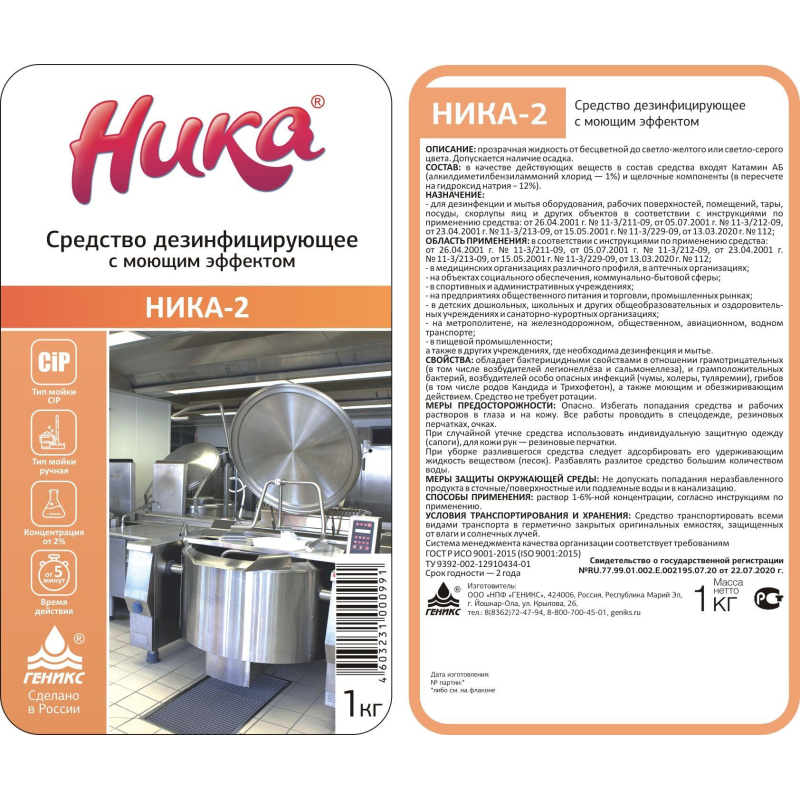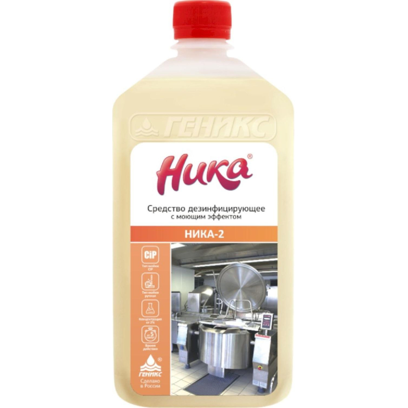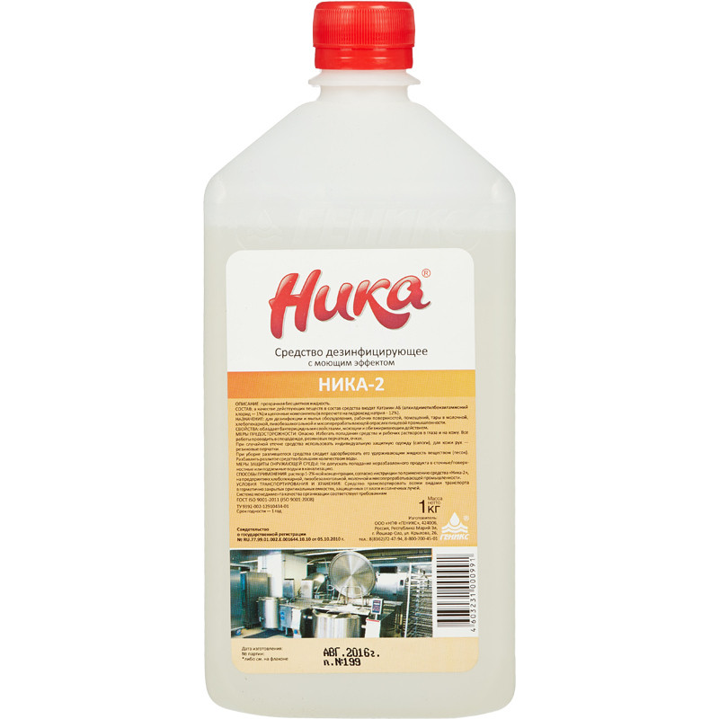 Средство дезинфицирующее с моющим эффектом Ника-2Назначение:Средство предназначено для дезинфекции и мытья оборудования, рабочих поверхностей, помещений, тары. Антимикробная активность - бактерии, особо опасные инфекции, грибки.Особенности:- обезжиривающие и дезодорирующие свойства;- способность разрушать находящиеся на поверхности биопленки микробного или белкового происхождения;- растворы средства не вызывают коррозии, не портят обрабатываемые поверхности;- средство не требует ротации;- дезинфекция товарного яйца.Область применения:- предприятия молочной промышленности- предприятия мясной промышленности- предприятия по производству напитков- предприятия хлебопекарной промышленности.Способ применения: рекомендуемая концентрация 1-2%.Меры предосторожности: при попадании в глаза, на кожу немедленно промыть большим количеством воды.Хранить в недоступном для детей месте.Состав: катамин АБ 1%, щелочь 12%.Срок годности: 24 месяца, срок годности рабочих растворов 21 день.Законодательные и технические документы: