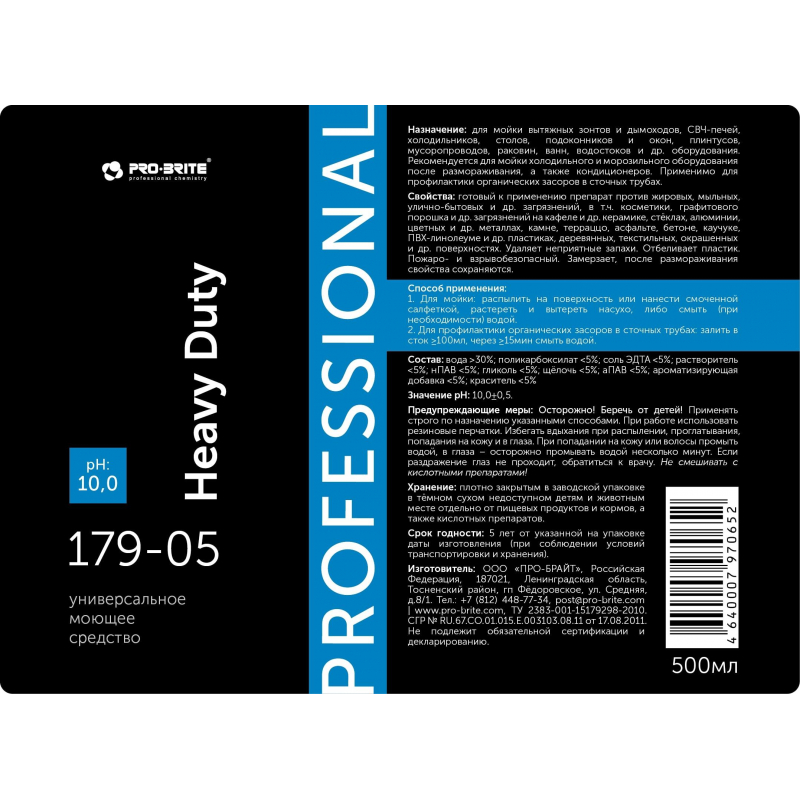 Универсальное моющее средство, готовый к применению препарат Pro-Bright Heavy Duty 179-05 500 млНазначение: для мойки вытяжных зонтов и дымоходов, СВЧ-печей, холодильников, столов, подоконников и окон, плинтусов, мусоропроводов, раковин, ванн, водостоков и др. оборудования. Рекомендуется для мойки холодильного и морозильного оборудования после размораживания, а также кондиционеров. Применимо для профилактики органических засоров в сточных трубах.Область применения: организации общественного питания, торговые и деловые центры, медицинские, образовательные, научные, финансовые, спортивно-оздоровительные, культурно-досуговые и иные учреждения, предприятия промышленности, гостиницы и вокзалы, все виды транспорта, в быту.Свойства: жидкий щелочной низкопенный готовый к применению препарат против жировых, мыльных, улично-бытовых и др. загрязнений, в т. ч. косметики, графитового порошка и др. загрязнений на кафеле и др. керамике, стёклах, алюминии, цветных и др. металлах, камне, тераццо, асфальте, бетоне, каучуке, ПВХ-линолеуме и др. пластиках, деревянных, текстильных, окрашенных и др. поверхностях. Удаляет неприятные запахи. Отбеливает пластик. Пожаро- и взрывобезопасный. Замерзает, после размораживания свойства сохраняются.Способ применения:1. Для мойки: распылить на поверхность или нанести смоченной салфеткой, растереть и вытереть насухо, либо смыть (при необходимости) водой.2. Для профилактики органических засоров в сточных трубах: залить в сток 100мл, через15мин смыть водой.Состав: вода более 30%; гликоль менее 5%; фосфаты менее 5%; соль ЭДТА менее 5%; растворитель менее 5%; аПАВ менее 5%; нПАВ менее 5%; щёлочь 5%; краситель менее 5%; ароматизирующая добавка менее 5%.Плотность: 1,00+0,05 г/см. кв. при 20°С.Значение pH 1%-раствора: 10+0,5Меры предосторожности: (Более подробная информация в паспорте безопасности) Осторожно! Беречь от детей! Применять строго по назначению указанными способами. При работе использовать резиновые перчатки. Избегать вдыхания при распылении, проглатывания, попадания на кожу и в глаза. При попадании на кожу или в глаза промыть водой, при необходимости обратиться к врачу. Не смешивать с кислотными препаратами!Хранение: плотно закрытым в заводской упаковке в тёмном сухом недоступном детям и животным месте отдельно от пищевых продуктов и кормов, а также кислотных препаратов.Срок годности: 5 лет от даты изготовления (при соблюдении условий транспортировки и хранения).Поставка товара возможна в ассортименте.
