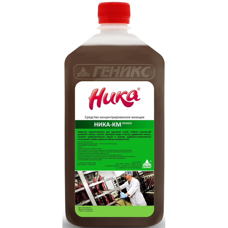 Средство концентрированное моющее 'Ника-КМ' (пенное)Назначение: Средство предназначено для удаления особо стойких отложений дымовой смолы, копоти, пригаров жира и белка, древесной смолы, нагаров индустриальных масел и смазок, асфальто-смолянистых отложений с любых щелочестойких поверхностей.Область применения: - предприятия молочной промышленности- предприятия мясной промышленности- предприятия по производству напитков- предприятия хлебопекарной промышленности.Способ применения: рекомендуемая концентрация 3-5%.Меры предосторожности: При попадании в глаза, на кожу немедленно промыть большим количеством воды.Хранить в недоступном для детей месте.Состав: щелочь 15%, ПАВ 5%, комплексообразователь.Срок годности: 18 месяцев. Законодательные и технические документы.