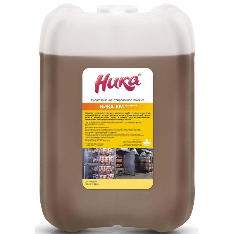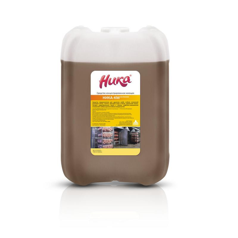 Средство концентрированное моющее 'Ника-КМ' (беспенное)Назначение: Средство предназначено для удаления особо стойких отложений дымовой смолы, копоти, пригаров жира и белка, древесной смолы, нагаров индустриальных масел и смазок, асфальто-смолянистых отложений с любых щелочестойких поверхностей.Область применения: - предприятия молочной промышленности- предприятия мясной промышленности- предприятия по производству напитков- предприятия хлебопекарной промышленности.Способ применения: рекомендуемая концентрация 3-5%.Меры предосторожности: При попадании в глаза, на кожу немедленно промыть большим количеством воды.Хранить в недоступном для детей месте.Состав: щелочь 15%, ПАВ 5%, комплексообразователь, пеногаситель.Срок годности: 18 месяцев. Законодательные и технические документы.