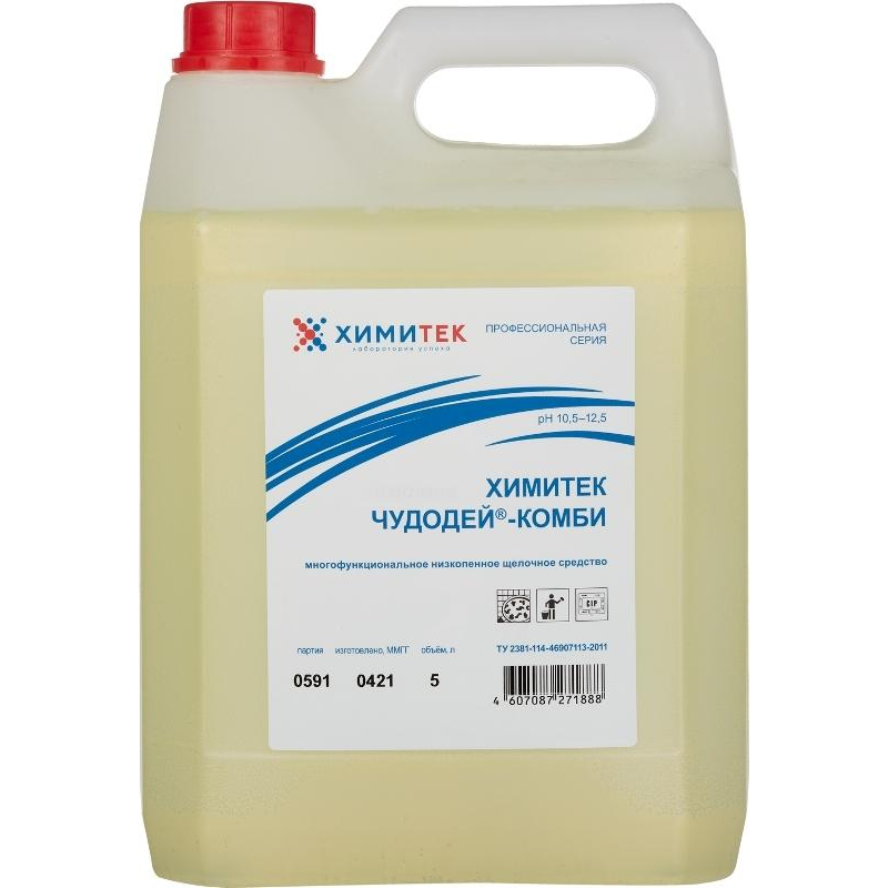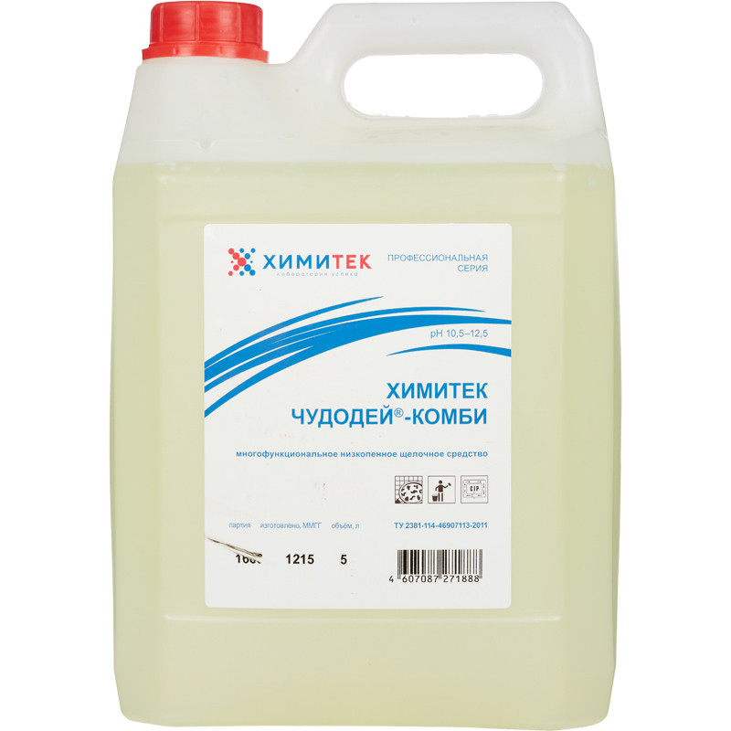 Многофункциональное концентрированное жидкое низкопенное щелочное средство Химитек Чудодей<sup class=reg>®</sup>-Комби Назначение: Предназначено для мойки пищевого технологического оборудования, трубопроводов, тары, инвентаря, посуды и других твердых поверхностей. Эффективно удаляет масложировые, белковые и пигментные загрязнения, плесень. Рекомендуется для различных технологий использования, включая CIP-мойку. Используется при стирке мешков для отжима творога из различных материалов (лавсан, бязь, хлопок, серпянка). Применяется на объектах пищевой промышленности, предприятиях общественного питания, в ЛПУ, санаторно-курортных, детских, дошкольных, школьных и других учреждениях различного профиля. Способ применения: Перед использованием средство рекомендуется перемешать. Средство используется в виде концентрата или 0,2%—5,0% рабочих растворов в зависимости от степени, характера загрязнений и способа мойки. Рабочие растворы готовят в емкостях из нержавеющей стали и полимерных материалов добавлением концентрата в воду. Температурный режим разведения и применения -от 20°C до 40°C. При ручном способе обработки твердых поверхностей 0,5%—5,0% рабочие растворы наносят методами орошения, протирания, замачивания. Смывание (ополаскивание) производят через 5-30 минут. Ориентировочный расход раствора 20-40 г на 1 м². Для автоматической и CIP-мойки рекомендуются 0,2%—1,0% рабочие растворы. Для удаления плесени используется в виде концентрата. При машинной стирке мешков для отжима творога рекомендуется загрузка из расчета 30-35 мл средства на 1 кг мешков. Температурный режим не выше 35°C. Срок хранения растворов -не более 3 суток. Меры предосторожности: Избегать попадания средства в глаза и на кожу. При работе со средством использовать защитные очки, перчатки. Рекомендуется пользоваться средствами индивидуальной защиты органов дыхания. В случае попадания средства в глаза или на кожные покровы рекомендуется промывание проточной водой. При необходимости обратиться к врачу. Условия хранения: Хранить в сухих крытых складских помещениях в герметично закрытой таре в защищенном от света месте, вдали от источников тепла, кислот, щелочей, тяжелых металлов и их соединений, а также сильных окислителей при температуре окружющей среды от 0°C до +25°C. Состав: Вода 30%, щелочь 5%, но <15%, неорганические соли <5%, хлорсодержащий компонент <5%, комплексообразователи <5%. Срок годности: 9 месяцев при соблюдении условий хранения в невскрытой упаковке производителя.