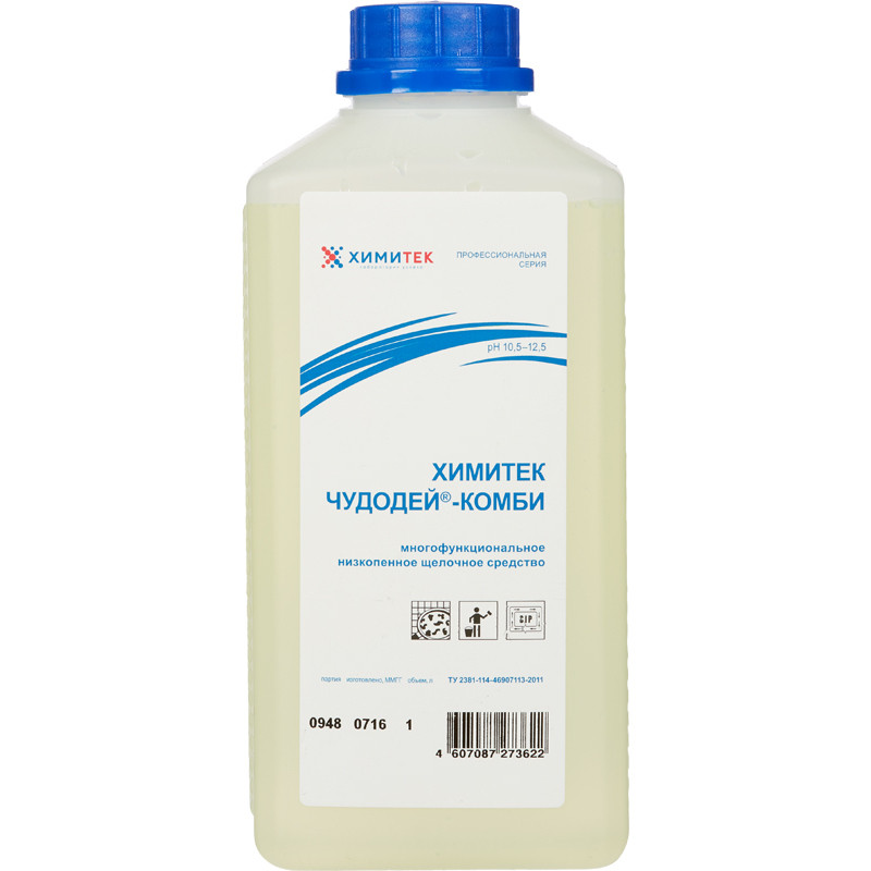 Многофункциональное концентрированное жидкое низкопенное щелочное средство Химитек Чудодей<sup class=reg>®</sup>-Комби Назначение: Предназначено для мойки пищевого технологического оборудования, трубопроводов, тары, инвентаря, посуды и других твердых поверхностей. Эффективно удаляет масложировые, белковые и пигментные загрязнения, плесень. Рекомендуется для различных технологий использования, включая CIP-мойку. Используется при стирке мешков для отжима творога из различных материалов (лавсан, бязь, хлопок, серпянка). Применяется на объектах пищевой промышленности, предприятиях общественного питания, в ЛПУ, санаторно-курортных, детских, дошкольных, школьных и других учреждениях различного профиля. Способ применения: Перед использованием средство рекомендуется перемешать. Средство используется в виде концентрата или 0,2%—5,0% рабочих растворов в зависимости от степени, характера загрязнений и способа мойки. Рабочие растворы готовят в емкостях из нержавеющей стали и полимерных материалов добавлением концентрата в воду. Температурный режим разведения и применения -от 20°C до 40°C. При ручном способе обработки твердых поверхностей 0,5%—5,0% рабочие растворы наносят методами орошения, протирания, замачивания. Смывание (ополаскивание) производят через 5-30 минут. Ориентировочный расход раствора 20-40 г на 1 м². Для автоматической и CIP-мойки рекомендуются 0,2%—1,0% рабочие растворы. Для удаления плесени используется в виде концентрата. При машинной стирке мешков для отжима творога рекомендуется загрузка из расчета 30-35 мл средства на 1 кг мешков. Температурный режим не выше 35°C. Срок хранения растворов -не более 3 суток. Меры предосторожности: Избегать попадания средства в глаза и на кожу. При работе со средством использовать защитные очки, перчатки. Рекомендуется пользоваться средствами индивидуальной защиты органов дыхания. В случае попадания средства в глаза или на кожные покровы рекомендуется промывание проточной водой. При необходимости обратиться к врачу. Условия хранения: Хранить в сухих крытых складских помещениях в герметично закрытой таре в защищенном от света месте, вдали от источников тепла, кислот, щелочей, тяжелых металлов и их соединений, а также сильных окислителей при температуре окружющей среды от 0°C до +25°C. Состав: Вода 30%, щелочь 5%, но <15%, неорганические соли <5%, хлорсодержащий компонент <5%, комплексообразователи <5%. Срок годности: 9 месяцев при соблюдении условий хранения в невскрытой упаковке производителя.