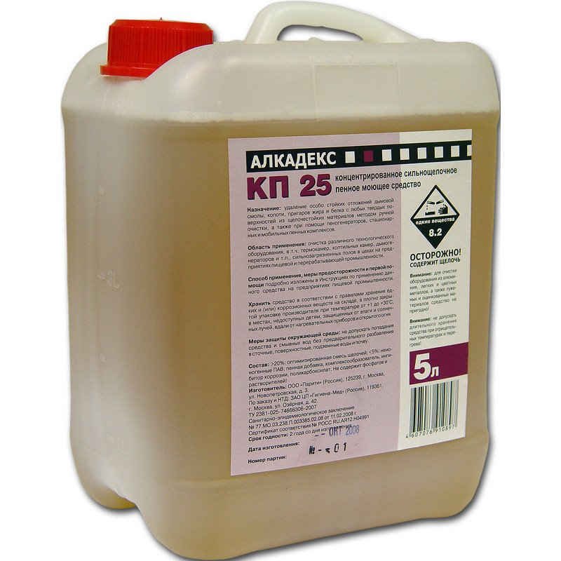 Сильнощелочное пенное моющее средство Алкадекс КП 25<br><b>Назначение: </b><br>Средство предназначено для очистки различного технологического оборудования из любых щелочестойких материалов: термокамер, коптильных камер, дымогенераторов, котлов для варки, жаровочных шкафов, фритюрниц, грилей, хлебопекарных печей, калориферов, вентиляции, сильно загрязненных полов в цехах. Удаляет стойкие отложения дымовой смолы, копоти, нагаров, жира и белка и других органических загрязнений, работает в воде любой жесткости, в холодной воде. Применяется для прочистки канализационных стоков от масложировых отложений на предприятиях пищевой и перерабатывающей промышленности, общественного питания и в быту, а так же для мойки транспортных средств для перевозки продуктов питания, различных объектов коммунальных служб (мусоровозы, мусоропроводы).<br><b>Способ применения: </b><br>Мойку коптильных камер, термокамер, дымогенераторов, хлебопекарных печей и другого термооборудования осуществляют автоматическим, механизированным способом или вручную путем нанесения рабочего раствора средства 1,5%-5,0% концентрации, при температуре рабочего раствора 20°C-80°C, экспозиции 5-20 минут. При наличии сложных и застарелых загрязнений после применения автоматической и механизированной мойки обработать поверхность вручную при помощи щеток, ветоши или губки.<br>Мойку котлов для варки, фритюрниц, грилей и пр.осуществляют методом заполнения рабочей емкости 3,0%-5,0% раствором средства и нагревом рабочего раствора до температуры 60°C-80°C. Продолжительность воздействия при заданной температуре 15-30 минут, после этого рекомендуется обработать поверхность вручную при помощи щеток. При применении механизированного способа мойки (пенная мойка) нанести рабочий раствор средства 3,0%-5,0% концентрации на предварительно нагретую до температуры 50°C-70°C поверхность, выдержать 5-10 минут, растереть вручную при помощи щеток.<br>Сильно загрязненные поверхности производственных помещений: стены, полы обрабатывают пенным способом или вручную 0,5-2,5% раствором средства при температуре 20°C-60°C, экспозиции 5-20 минут.<br><b>Меры предосторожности: </b><br>При попадании средства в глаза или на кожу немедленно промыть большим количеством воды. При необходимости обратиться за медицинской помощью.<br>Хранить в недоступном для детей месте.<br><b>Состав: </b><br>Едкий натрий, едкий калий, оптимизированная смесь пенных ПАВ, ингибитор коррозии, комплексообразующие вещества, активные моющие компоненты.<br><b>Условия хранения: </b><br>Хранить средство в закрытом вентилируемом складском помещении в оригинальных емкостях производителя при температуре от +1°C до +30°C, вдали от источников тепла, избегая попадания прямых солнечных лучей, отдельно от пищевых продуктов.<br><b>Срок годности: </b> 24 месяца с даты изготовления.
