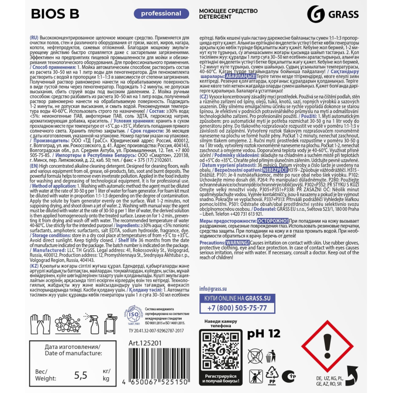 Очиститель индустриальный для удаления сложных и застарелых загрязнений Grass BIOS-В 5.5 кг (концентрат) Назначение Применяется для очистки промышленного оборудования, ж/д цистерн, емкостей и хранилищ от нефтепродуктов, растительных и животных жиров с различных поверхностей. Способ применения Для ручной или автоматической мойки растворить состав из расчета 30-50г/л воды, нанести на обрабатываемую поверхность, экспозиция 1-2 минуты, не допускать высыхания, сбить струей воды под давлением. Рекомендуемая температура воды 40-60 градусов. Меры предосторожности Работу осуществлять в перчатках. При попадании в глаза промыть большим количеством воды и обратиться к врачу. Средство может использоваться от 10 до 40 °C. Перед первым применением убедитесь (в незаметном месте), что не повреждает очищаемую поверхность. Не применять на алюминии и термопластиковых поверхностях. Только для профессионального использования! Состав 5-15% неионогенные ПАВ,<5% соль ЭДТА, гидроксид натрия, ароматизирующий компонент, краситель. ГОСТ/ТУ ТУ 2380-005-92962787-11 Условия хранения В сухом темном месте при температуре от 0 до 35 °C. Хранить в плотно закрытой упаковке в местах, недопустимых для детей. Срок годности 36 месяцев.