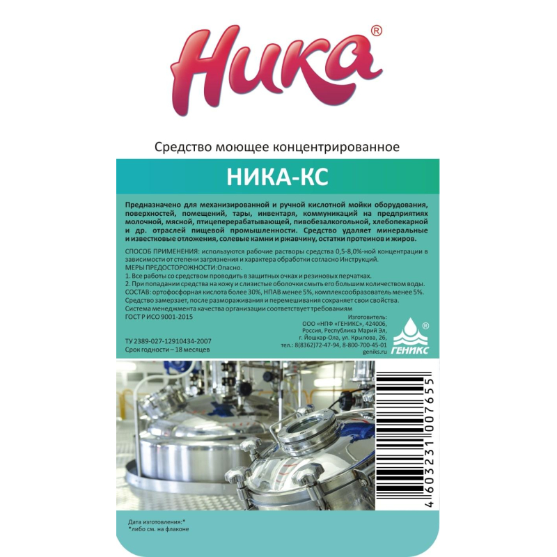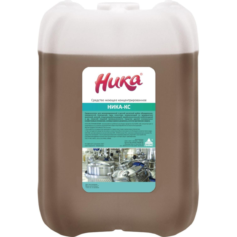 Моющее средство Ника-КС 7 кг (концентрат) Назначение: для удаления минеральных отложений, в том числе карбонатных, накипи, ржавых подтеков, солей кальция, магния, железа, а также пивного, молочного камня. Рекомендуется применять периодически, для удаления застарелых, сильных и стойких загрязнений, например, послестроительных загрязнений (цементное молоко, подтеки затирок для плитки, остатки цемента, пыль от отделочных материалов и так далее). Применяется для механизированной и ручной кислотной мойки емкостного и неемкостного пищевого оборудования, коммуникаций, кегов, инвентаря, выполненных из кислотостойких материалов, а также поверхностей производственных помещений (полов, стен), выполненных из материалов, выдерживающих кислотную обработку, для постоянной кислотной мойки внутренних поверхностей оборудования: пастеризаторов, стерилизаторов, вакуум-аппаратов, нагревателей, испарителей, инвентаря и инструментов (ножи, ножницы, вилки, шприцовочный аппарат), куттеров, мешалок, а также для периодической очистки резервуаров, трубопроводов, в том числе контактирующих с пищевыми продуктами, от остатков протеинов и жиров преимущественно механизированным (циркуляционным, СIP) способом, методом циркуляции, погружения, распыления. Способ применения: используются рабочие растворы средства 0,5-8,0% концентрации в зависимости от степени загрязнения и характера обработки согласно Инструкции. Рабочие растворы средства готовят из концентрата путем растворения его в воде температурой от 20°С до 70°С. Рабочие растворы стабильны в течение 7 дней и при хранении не разлагаются. Состав: Ортофосфорная кислота более 30%, НПАВ менее 5%, комплексообразователь менее 5%. Значение pH 1-% раствора: 1,5-2,5 Меры предосторожности: При работе с рабочими растворами и концентратом средства необходимо: соблюдать меры предосторожности принятые при работе с химическими веществами; использовать средства индивидуальной защиты глаз, рук, органов дыхания; избегать попадания средства на кожу и глаза; при попадании средства на кожу, смыть его большим количеством воды; при попадании средства в глаза - обильно промыть водой, после чего закапать 30% раствором сульфацила натрия при необходимости обратится к врачу; при лучайном попадании средства в желудок следует выпить несколько стаканов воды с измельченными таблетками активированного угля (10-15 шт), рвоту не вызывать, обратится к врачу; не смешивать с щелочными моющими средствами. Условия хранения: хранить в соответствии с правилами хранения едких и (или) коррозионных веществ на складе, в плотно закрытой упаковке производителя. Средство в химическом отношении стабильно в воде и на воздухе, не разлагается с выделением вредных веществ. Не содержит токсичных веществ, растворителей, ароматизаторов. Средство биоразлогаемо и пожаро-взрывобезопасно. Срок годности: 18 месяцев с даты изготовления. Законодательные и технические документы.