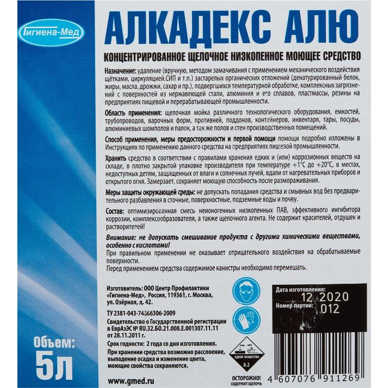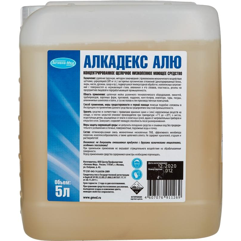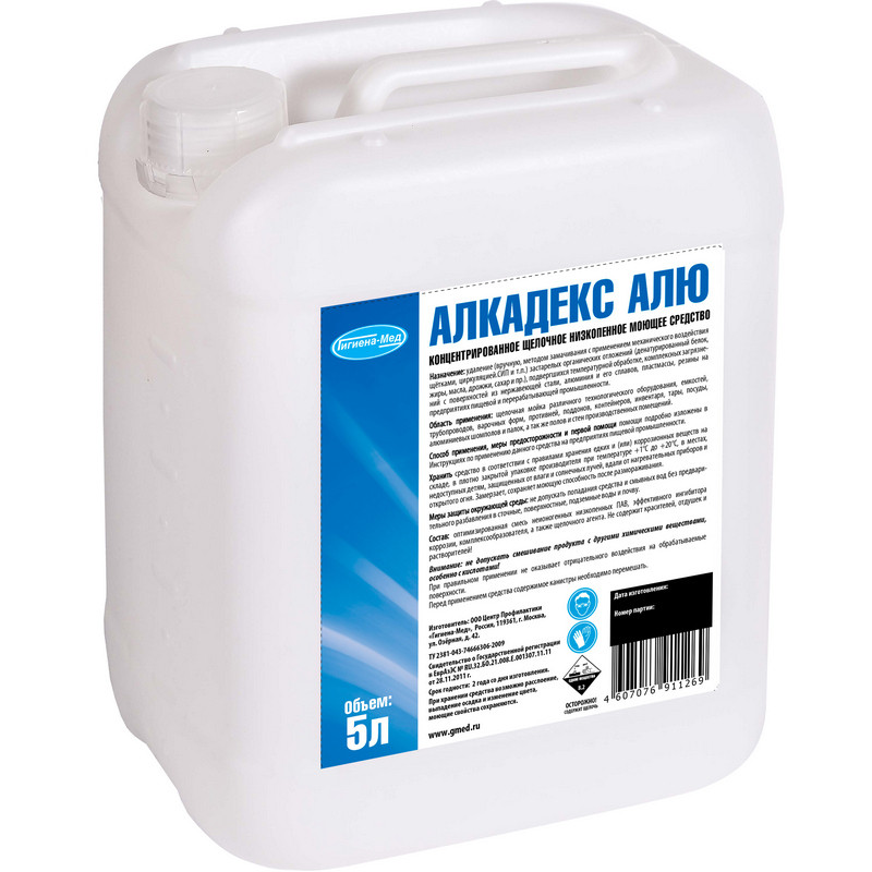 Концентрированное щелочное низкопенное моющее средство Алкадекс АЛЮ<br><b>Назначение: </b><br>Средство предназначено для удаления застарелых органических отложений (денатурированный белок, жиры, масла, дрожжи, сахар), подвергшихся температурной обработке, комплексных загрязнений с поверхностей из нержавеющей стали, алюминия и его сплавов, пластмассы, резины на предприятиях пищевой и перерабатывающей промышленности.<br>Применяется для щелочной мойки различного технологического оборудования, емкостей трубопроводов, варочных форм, противней, поддонов, контейнеров, инвентаря, тары, посуды, алюминиевых шомполов и палок, а также полов и стен производственных помещений.<br><b>Способ применения: </b><br>Для мойки объектов и поверхностей рекомендуется использовать рабочий раствор концентрации 2,0%-5,0%. Концентрация рабочего раствора зависит от характера и степени загрязненности поверхности, типа оборудования и метода применения. Температура воды, используемая для приготовления рабочего раствора - от 20°C до 90°C.<br>Обработку тары и КЕГ осуществляют механизированным способом в специализированных машинах, концентрация 1,0%-2,0%, температура в зоне мойки 55°C-65°C, при этом необходимо руководствоваться инструкцией по эксплуатации оборудования.<br><b>Меры предосторожности: </b><br>При попадании средства в глаза или на кожу немедленно промыть большим количеством воды. При необходимости обратиться за медицинской помощью.<br>Хранить в недоступном для детей месте.<br><b>Состав: </b><br>Оптимизированная смесь неионогенных низкопенных ПАВ, эффективного ингибитора коррозии, комплексообразователя, щелочного агента.<br><b>Условия хранения: </b><br>Хранить в соответствии с правилами хранения едких и (или) коррозионных веществ на складе, в плотно закрытой упаковке производителя при температуре от +1°C до +20°C, в местах, защищенных от влаги и солнечных лучей, вдали от нагревательных приборов и открытого огня.<br><b>Срок годности: </b> 24 месяца с даты изготовления.