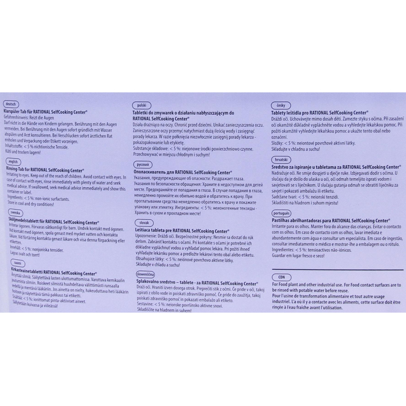 Таблетки для пароконвектомата серии SCC Rational Care-tab (50 таблеток в упаковке) Назначение: таблетки для ополаскивания Rational предназначены для пароконветоматов серии SCC. Почти на 100% эффективнее, чем аналогичные жидкие средства. Специальные таблетки с интенсивным комплексом активных составляющих. Высококонцентрированные таблетки отличаются экономичностью и простотой применения. Способ применения: в зависимости от того, насколько загрязнен пароконвектомат, очистка рабочей камеры может потребовать различного количества моющих и ополаскивающих таблеток (1-6 штук). Таблетки помещают внутрь рабочей камеры, в отведенное для них место, после чего аппарат запускается в режим автоматической мойки. Состав: менее 5% неионогенные тензиды. Значение pH 1-% раствора - 12. Срок годности: 2 года с момента производства (при соблюдении условий хранения, рекомендованных производителем).