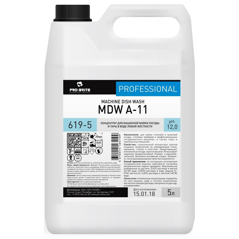 Концентрат для машинной мойки посуды и тары в воде любой жёсткости Pro-Bright MDW А-11 619-5 5 л Назначение: для мойки столовой и кухонной посуды, столовых приборов в профессиональных посудомоечных машинах. Область применения: организации общественного питания, пищевые производства. Свойства: жидкий сильнощелочной низкопенный концентрат против пищевых загрязнений на нержавеющей стали, стекле, керамике и пластике. Предотвращает отложения на посуде, таре и в машине. Не вызывает коррозию. Биоразлагаемый. Пожаро- и взрывобезопасный. Замерзает, после размораживания свойства сохраняются. Способ применения: по инструкции изготовителя посудомоечной машины произвести настройку автоматической подачи препарата. Максимальное разбавление: - 1:5000 (0,02%-раствор) в мягкой ( 4°Ж) воде; - 1:4000 (0,025%-раствор) в воде средней (4-8°Ж) жёсткости; - 1:2000 (0,05%-раствор) в жёсткой ( 8°Ж) воде. Температурный режим мойки 50-70°С. После мойки использовать ополаскиватель. Примечание: оптимальную концентрацию определять по типу машины, виду и степени загрязнения, жёсткости и температуре воды и др. условиям мойки. Состав: вода более 30%; аПАВ более 5%, но менее 15%; соль неорганическая менее 5%; амф. ПАВ менее 5%; нПАВ менее 5%; консервант менее 5%. Плотность: 1,29+0,05 г/см.кв. при 20°C. Значение pH 1%-раствора: 12,5+0,5 Меры предосторожности: (Более подробная информация в паспорте безопасности) Опасно! Использовать резиновые перчатки, защитные очки и спецодежду. Избегать проглатывания, попадания на кожу и в глаза. При попадании на кожу или в глаза промыть водой, обратиться к врачу. Не использовать на алюминии и цветных металлах! Хранение: плотно закрытым в заводской упаковке в тёмном сухом месте отдельно от пищевых продуктов и кормов, а также кислотных препаратов. Срок годности: 5 лет от даты изготовления (при соблюдении условий транспортировки и хранения).