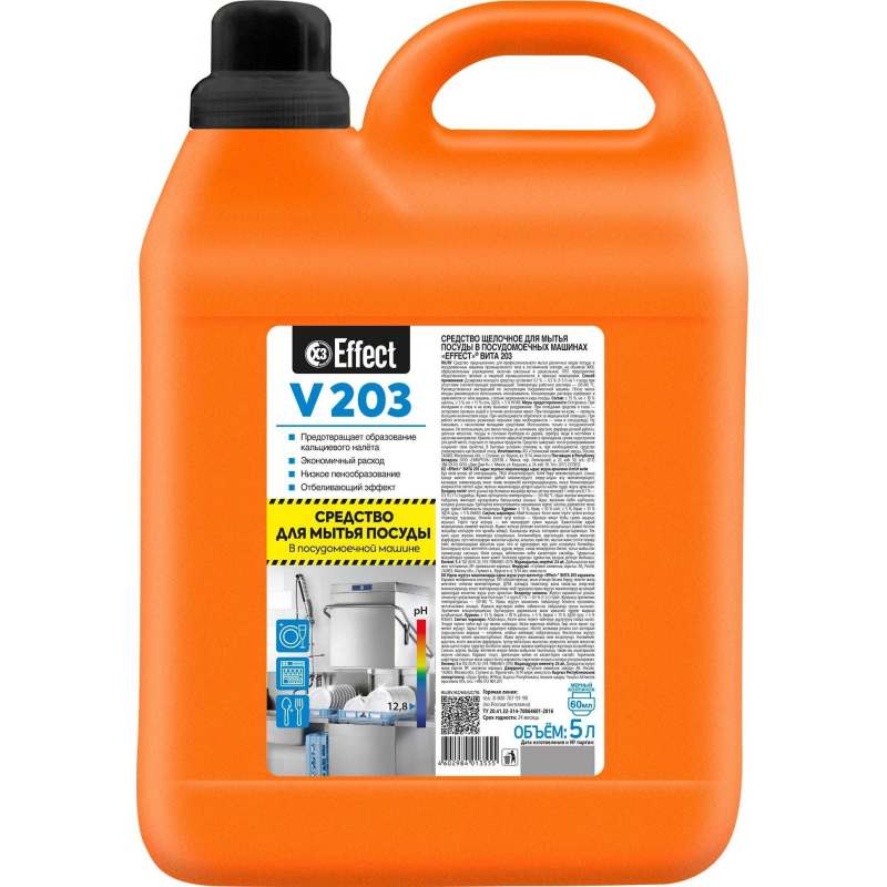 Средство щелочное для мытья посуды в посудомоечных машинах Effect Vita 203Назначение: Предназначено для мытья различных видов посуды в посудомоечных машинах промышленного типа. Применяется для мытья фарфоровой, стеклянной, фаянсовой посуды, а также для посуды из высококачественной стали, пластмассы.Рекомендуется использовать в посудомоечных машинах на предприятиях общественного питания, ресторанах, кафе, столовых, лечебно-профилактических учреждениях.Способ применения: Дозировка моющего средства составляет 0,1%-0,5% на 1 л воды (1-5 г) при отсутствии соответствующих рекомендаций. Температура рабочего раствора 50°C-80°C. После мытья посуды рекомендуется использовать ополаскиватель. Руководствоваться инструкцией по эксплуатации посудомоечной машины. Оптимальные концентрации рабочего раствора подбираются в каждом конкретном случае в зависимости от типа машины, степени загрязнения и вида посуды.Меры предосторожности: Осторожно, содержит щелочь! Не допускать контакта с кожей и попадания в глаза. При работе использовать резиновые перчатки, очки, спецодежду. При попадании на кожу или на слизистую оболочку глаз концентрированного средства - промыть большим количеством воды. При необходимости обратиться к врачу. Не смешивать с кислотными моющими средствами. Не использовать концентрат для обработки поверхностей из алюминия, цветных металлов и для очистки нестойких к щелочам поверхностей. Хранить плотно закрытым, в недоступных для детей местах. Упаковку утилизировать как бытовой отход.Условия хранения: Хранить в темном прохладном месте при температуре от -15°C до +35°C.Состав: 15%, но <30% щелочь, 5%, но <15% соль ЭДТА, <5% НПАВ.Срок годности: 2 года. Внешний вид продукта может отличаться от представленного на сайте в связи с переходом на другую упаковку
