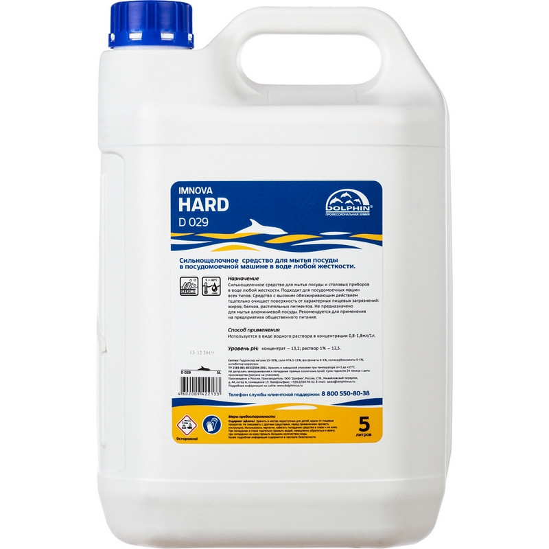 Профессиональное средство для мытья посуды в посудомоечных машинах Dolphin Hard Imnova 5 л Назначение: Предназначено для посудомоечных машин всех типов. Средство с высоким обезжиривающим действием тщательно очищает поверхность от характерных пищевых загрязнений - жиров, белков, растительных пигментов. Низкопенное, сильнощелочное средство подходит для автоматических посудомоечных машин всех типов на предприятиях общественного питания и других профильных учреждениях. Способ применения:Используется в виде водного раствора в концентрации 0,8-1,8 мл/1 л. При сильном загрязнении рекомендуется предварительно споласкивать посуду в холодной воде. Не предназначено для мытья алюминиевой посуды. Температура рабочего раствора: от 5 до 60 градусов по Цельсию. Меры предосторожности: Перед применением ознакомьтесь с инструкцией и паспортом безопасности. Средство содержит щелочь! Хранить вдали от пищевых продуктов в недоступных для детей местах. Не смешивайте с другими средствами. Используйте перчатки! Избегайте попадания средства в глаза или на кожу. При попадании на кожу - промыть большим количеством воды, при необходимости обратиться к врачу. При попадании в глаза - промыть большим количеством воды, немедленно обратиться к врачу. Условия хранения: Хранить в сухом прохладном месте. Предохранять от попадания прямых солнечных лучей. Состав: гидроксиды щелочных металлов и комплексообразователи 15% и более, но менее 30%. Срок годности: 2 года.