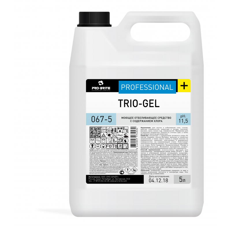 Моющее отбеливающее средство с содержанием хлора Pro-Bright Trio-Gel 067-1 1 л Назначение: для чистки и отбеливания стен, столов, рабочих поверхностей, инвентаря и посуды, унитазов, раковин, ванн, полов и др. поверхностей. Применимо для устранения неприятных запахов из сточных труб, а также для уборки туалетов для животных. Область применения: организации общественного питания, пищевые производства, медицинские, образовательные (в т. ч. школьные и дошкольные), научные, финансовые, спортивно-оздоровительные и культурно-досуговые учреждения, торговые и деловые центры, предприятия промышленности, гостиницы и вокзалы, все виды транспорта, в быту. Свойства: гелеобразный сильнощелочной концентрат с содержанием активного хлора 4% против пищевых, улично-бытовых, мыльных и слизистых загрязнений, а также серого налета и следов плесени на керамических, каменных, пластиковых и деревянных поверхностях, на нержавеющей стали. Уничтожает патогенные микроорганизмы, в т. ч. плесневые микрогрибы и их споры. Легко смывается. Биоразлагаемый. Пожаро и взрывобезопасный. Замерзает, после размораживания свойства сохраняются. Способ применения: использовать вручную или замачиванием. Температурный режим мойки 20-40°С. 1. Для чистки и отбеливания унитаза: использовать концентрат, распределить гель по поверхности, через 3-5мин смыть водой. 2. Для уборки полов и стен: максимальное разбавление 1:100 (10мл+990мл воды=1л 1%-раствора), нанести раствор на поверхность и смыть водой. 3. Для отбеливания посуды и инвентаря: в теплую (около 40°С) воду добавить из расчета 1:10 (100мл+900мл воды=1л 10%-раствора), поместить посуду (инвентарь), через 10-25мин (после достижения нужного эффекта!) промыть водой. 4. Для удаления следов плесени: использовать концентрат, нанести гель на пятно, через 20мин растереть щеткой и смыть водой. 5. Для устранения неприятных запахов из сточных труб: залить 250-500мл концентрата в сток, через 15-30мин смыть водой. Примечание: оптимальную концентрацию определять по виду и степени загрязнения, жесткости и температуре воды, типу поверхности и др. условиям мойки. Состав: вода более 30%; гипохлорит натрия более 30%; аПАВ более 5%, но менее 15%; нПАВ менее 5%; щелочь менее 5%; соль неорганическая менее 5%; фосфонат менее 5%; ароматизирующая добавка менее 5%. Плотность: 1,10+0,05 г/см. кв. при 20°С Значение pH 1%-раствора: 11,5+0,5 Меры предосторожности: (Более подробная информация в паспорте безопасности) Опасно! Беречь от детей! Применять строго по назначению указанными способами. При работе использовать резиновые перчатки, спецодежду и защитные очки. Избегать вдыхания паров, проглатывания, попадания на кожу и в глаза. При попадании на кожу или в глаза промыть водой, при необходимости обратиться к врачу. Не смешивать с кислотными препаратами! Не использовать на алюминии и цветных металлах, а также для мойки ламината, паркета и полов из пробки! Не допускать попадания концентрата в открытые водоемы! Хранение: Хранение: плотно закрытым в заводской упаковке в темном сухом недоступном детям и животным месте отдельно от пищевых продуктов и кормов. Не допускать воздействия прямых солнечных лучей и нагрева 30°С! Срок годности: 18 месяцев от даты изготовления (при соблюдении условий транспортировки и хранения).