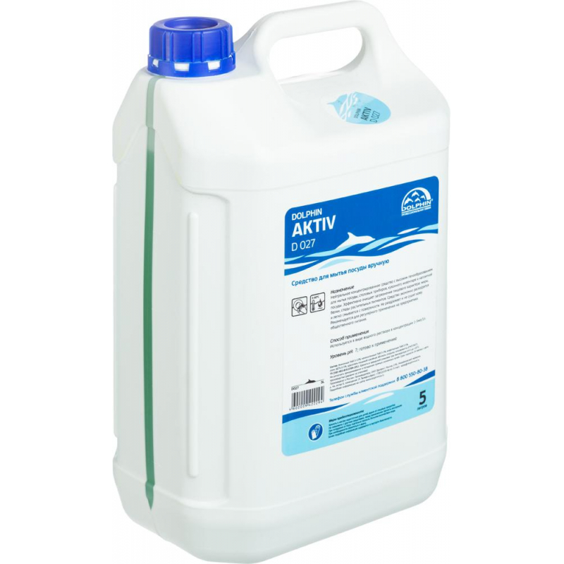 Средство для мытья посуды вручную Dolphin Aktiv D027 5 л Назначение: для мытья посуды, столовых приборов, кухонного инвентаря и наплитной посуды. Область применения: рекомендуется для регулярного применения на предприятиях общественного питания. Свойства: нейтральное концентрированное средство с высоким пенообразованием. Эффективно очищает загрязнения пищевого характера: жиры, белки, следы растительных пигментов. Средство экономно расходуется и легко смывается с поверхности. Не раздражает и не сушит кожу. Способ применения: используется в виде водного раствора в концентрации 1-5 мл / 1 л. Состав: анионные ПАВ 5-15%, неионогенные ПАВ 0-5%, амфотерные ПАВ 0-5%, соли ЭДТА 0-5%, краситель пищевой 'зеленое яблоко', отдушка, консерванты (CMIT/MIT). ГОСТ/ТУ: ТУ 2383-002-85522504-2011. Плотность: 1,02 г/куб.см. при 20°С. Значение pH 1 025-раствора: 7. Меры предосторожности (подробная информация см. паспорт безопасности): не смешивать с другими средствами, перед применением прочесть инструкцию. При попадании в глаза тщательно промыть большим количеством воды. При необходимости обратиться к врачу. Условия хранения: хранить в заводской упаковке при температуре 5-25°С. Не допускать замораживания и попадания прямых солнечных лучей. Хранить в местах недоступных для детей, вдали от пищевых продуктов. Срок годности: 24 месяца (с даты производства).