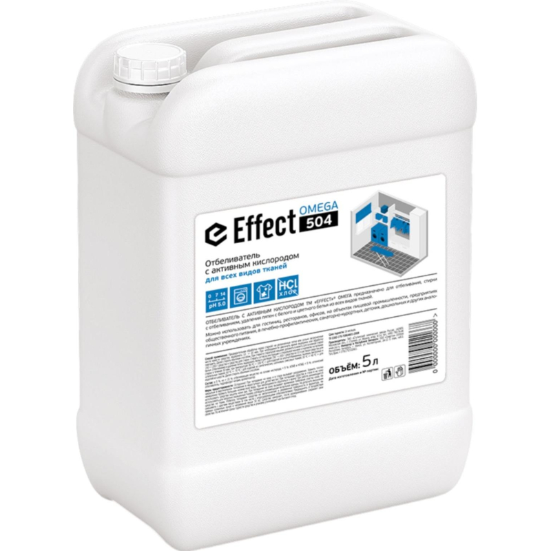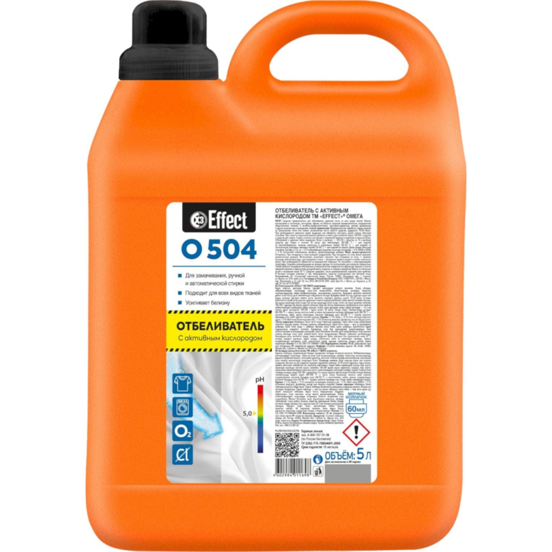 Отбеливатель Effect Omega 504 5 л (концентрат). Назначение: Предназначено для отбеливания, стирки с отбеливанием, удаления пятен с белого и цветного белья из всех видов тканей. Можно использовать для гостиниц, ресторанов, офисов, на объектах пищевой промышленности, предприятиях общественного питания, в лечебно-профилактических, санаторно-курортных, детских, дошкольных и других аналогичных учреждениях. Способ применения: Предварительная обработка перед стиркой: на увлажненные пятна или сильно загрязненные места нанести средство, выдержать 10-20 мин. При необходимости увеличить время выдержки или обработку повторить. Далее стирать обычным способом. При стирке в стиральной машине: добавить в кювету для основной стирки 150-200 г средства к средству для стирки. Стирать согласно инструкции к стиральной машине и надписям на ярлыках белья. Отбеливание и удаление пятен: выдержать белье в растворе 150-200 г средства на 10 л раствора средства для стирки в течение 30 минут при температуре: - 80°C-100°C - для изделий из хлопчатобумажных, льняных, вискозных и штапельных тканей; - 60°C-70°C - для изделий из синтетических, шелковых, смесовых тканей; - 30°C-40°C - для изделий из шерсти; Далее стирать обычным способом. Меры предосторожности: Осторожно! При попадании на кожу и в глаза вызывает раздражение. Хранить плотно закрытым в вертикальном положении в недоступных для детей местах! При попадании средства в глаза и на кожу немедленно промыть большим количеством воды. При необходимости обратиться к врачу! При работе рекомендуется использовать средства защиты кожи рук. При попадании на кожу вызывает временное побеление участка кожи. Не использовать для непрочно окрашенных тканей, соблюдать рекомендации на ярлыках одежды. Не допускать высыхания средства на ткани. Избегать попадания средства на металлические и деревянные поверхности и фурнитуру. Не смешивать с другими веществами (в том числе с хлорсодержащими отбеливателями). Средство замерзает, после размораживания сохраняет свои свойства. По истечении срока годности средство и упаковку утилизируют как бытовой отход. Условия хранения: Хранить в сухом прохладном месте. Предохранять от воздействия прямых солнечных лучей и нагревания выше +30°C. Состав: 5%, но <15%: отбеливающее вещество на основе кислорода, <5%: АПАВ и НПАВ, <5%: оптический отбеливатель, гидрофосфат натрия, ароматизатор. Срок годности: 18 месяцев с момента производства (при соблюдении условий хранения рекомендованных производителем).