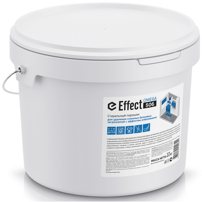 Стиральный порошок для удаления сложных белковых загрязнений с отбеливающим эффектом Effect Omega 506Назначение: Стиральный порошок на основе активного кислорода для одновременной дезинфекции (обеззараживания), отбеливания и стирки в стиральных машинах любого типа в профессиональных прачечных и для применения в быту:- постельного белья (в том числе больничного);- полотенец, накидок, салфеток, тапочек, ковриков;- рабочей одежды (в том числе медицинских костюмов и халатов);- уборочного инвентаря (мопов, ветоши);- любых текстильных изделий из хлопчатобумажных, льняных и смешанных волокон.Способ применения: Норма расхода составляет 25 г, 30 г и 35 г на 5 л воды в зависимости от жесткости воды. На 1 кг сухого белья требуется 5 л раствора.При ручной стирке: замачивание 20 минут, с последующей стиркой в том же растворе.Состав: 15%, но <30% отбеливатель на основе кислорода, 5%, но <15%: фосфаты, АПАВ, <5%: фосфонаты, НПАВ, энзимы, оптический отбеливатель, поликарбоксилаты, ароматизирующий компонент.Показатель pH 1%-го раствора: 11.Меры предосторожности: При работе со средством необходимо избегать пыления и попадания средства в глаза и на кожу. При попадании в глаза немедленно тщательно промыть их проточной водой в течение 10-15 минут. Разведение средства необходимо проводить с использованием защитных очков и резиновых перчаток. Использовать средство строго по назначению. Хранить в закрытой упаковке в местах недоступных детям. По истечении срока годности средство и упаковку утилизируют как бытовой отход.Условия хранения: Хранить в сухих складских помещениях на расстоянии не менее 1 м от нагревательных приборов при температуре не выше +30°C и влажности не более 90%.Срок годности: 24 месяца с момента производства (при соблюдении условий хранения рекомендованных производителем). Внешний вид продукта может отличаться от представленного на сайте в связи с переходом на другую упаковку