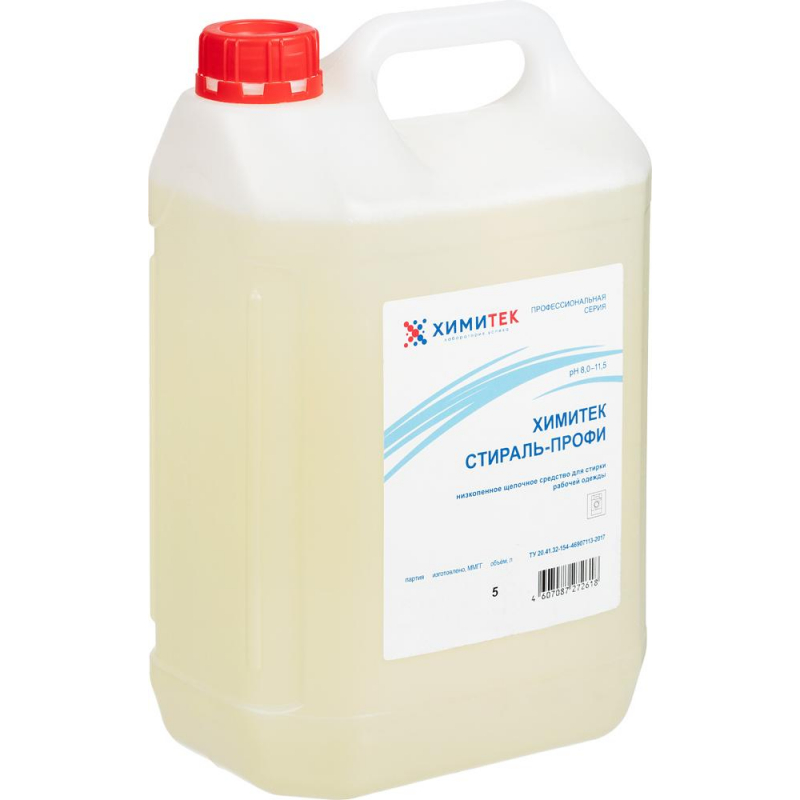 Концентрированное жидкое низкопенное щелочное средство для стирки рабочей одежды Химитек Стираль-Профи. Назначение: Предназначено для удаления различных видов загрязнений: растительных масел, животных жиров, отдельных видов пигментных, индустриальных, а также общебытовых загрязнений. Рекомендуется для стирки хлопчатобумажных, смешанных и синтетических тканей в профессиональных стиральных машинах любого типа на различных предприятиях, в том числе в ЛПУ, санаторно-курортных, детских, дошкольных, школьных и других аналогичных учреждениях, а также в быту. Способ применения: Перед использованием средство рекомендуется перемешать. Для основной стирки произвести загрузку средства в дозатор стиральной машины из расчета 10-20 мл на 1 л воды или 30-40 мл средства на 1 кг белья в зависимости от степени его загрязнения. Температурный режим 20 °C - 90 °C. Для предварительной стирки рекомендуется загрузка средства из расчета 5-10 мл на 1 л воды или 15-20 мл средства на 1 кг белья. Состав: вода 30% и более, неионогенные ПАВ 5%, но <15%, амфотерный ПАВ <5%, щелочь <5%, изопропанол <5%, неорганическая соль <5%, фосфонаты <5%, гликолевый эфир<5%, отдушка <5%. Показатель pH 1%-го раствора: 8.0-11.5. Меры предосторожности: Избегать попадания средства в глаза и на кожу. При работе со средством использовать защитные перчатки. Хранить в недоступном для детей месте. В случае попадания средства в глаза или на кожные покровы рекомендуется промывание проточной водой. При необходимости обратиться к врачу. Условия хранения: Хранить в закрытом виде при температуре от +5 °C до +40 °C. Срок годности: 24 месяца с момента производства (при соблюдении условий хранения, рекомендованных производителем).