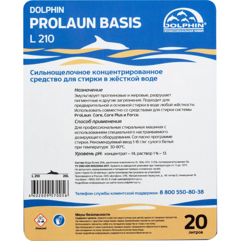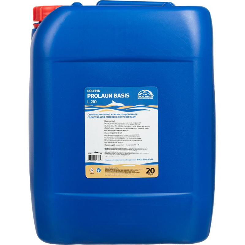 Жидкое средство для стирки в жесткой воде Dolphin ProLaun Basis L210 20 л (концентрат) Назначение: предназначено для стирки в профессиональных стиральных машинах с использованием дозирующих систем. Способ применения: согласно программе стирки. Рекомендуемый ввод 1-16 г/кг сухого белья при температуре 30-80°C. Состав: вода более 30%, щелочные компоненты 15-30%, НТА 5-15%, полиакрилаты менее 5%. Показатель pH 1 025-го раствора: 13. Меры предосторожности: хранить в местах недоступных для детей, вдали от пищевых продуктов. Не смешивать с другими средствами, перед применением прочесть инструкцию. Использовать перчатки, избегать попадания средства в глаза и на кожу. При попадании в глаза тщательно промыть водой, немедленно обратиться к врачу, при попадании на кожу промыть большим количеством воды. Условия хранения: хранить в заводской упаковке при температуре от 5 до 35°C. Не допускать замораживания и попадания прямых солнечных лучей. Срок годности: 2 года с момента производства (при соблюдении условий хранения рекомендованных производителем).