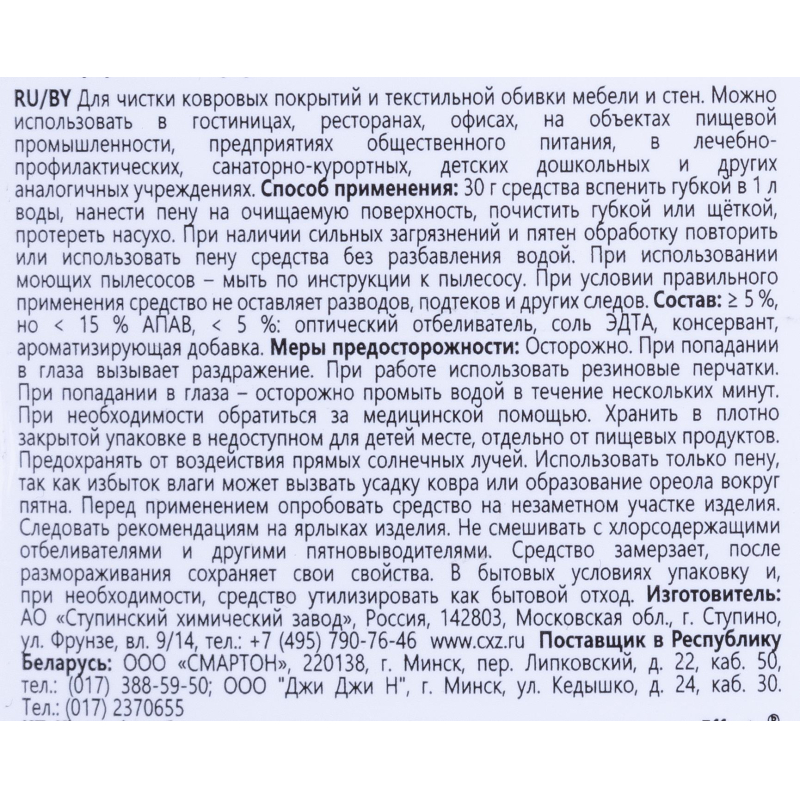 Нейтральное пенное средство для чистки ковровых покрытий Effect Delta 402 5 лНазначение. Предназначено для ухода текстильными поверхностями: ковролин, ковры с натуральным ворсом, обивка мягкой мебели. Не дает усадку и сохраняет цветовую гамму. Не оставляет разводов. Не подходит для использования с моющим пылесосом.Способ применения. Применяется для ручной чистки ковров.Для ручной очистки подготовить 3% (30 мл/ 1л воды) раствор, взбить пену, нанести пену на очищаемую поверхность губкой или щеткой, протереть насухо. После высыхания необходимо чистить поверхность пылесосом.Состав: 5%, но <15% АПАВ, <5% соль ЭДТА,<5%: оптический отбеливатель, консервант, ароматизирующий компонентСрок годности: 2 года с момента производства (при соблюдении условий хранения рекомендованных производителем) Внешний вид продукта может отличаться от представленного на сайте в связи с переходом на другую упаковку