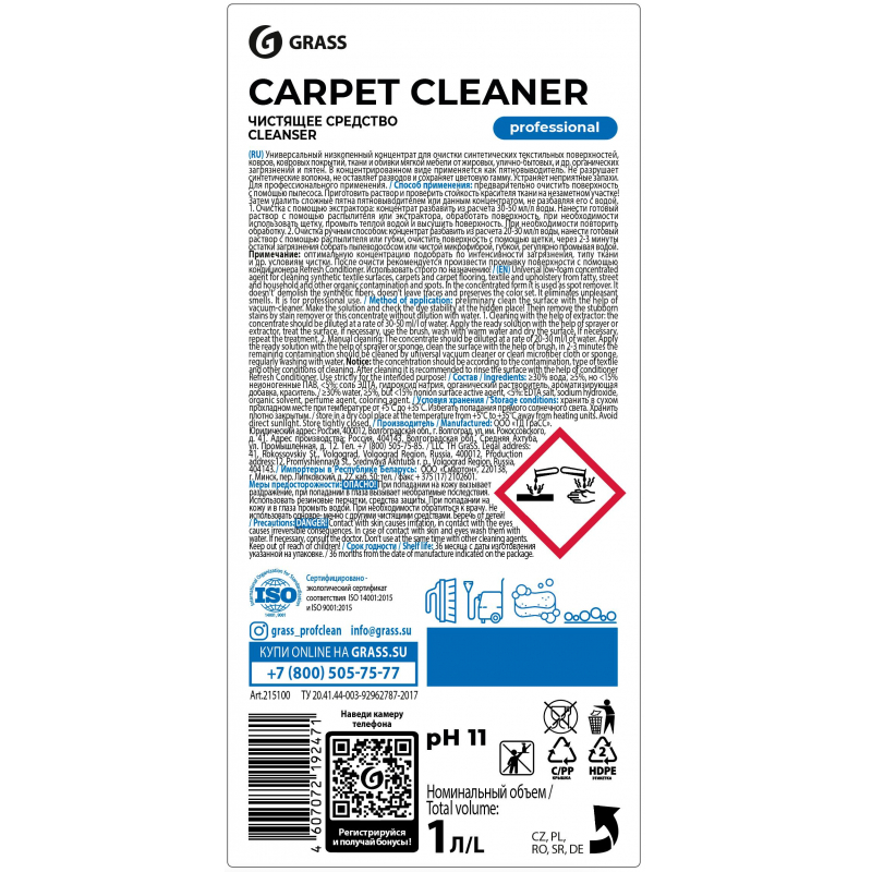 Щелочное низкопенное средство для чистки ковровых покрытий методом экстракции Grass Carpet Cleaner 1 л Назначение. Щелочной низкопенный концентрат против жировых, улично-бытовых и других загрязнений с ковровых покрытий. Не разрушает волокна. Не дает усадку и сохраняет цветовую гамму. Не оставляет разводов. Биоразлагаемый. Пожаро- и взрывобезопасный. Замерзает, после размораживания свойства сохраняются.Способ применения. Применяется для машинной уборки.Очистить поверхность пылесосом, удалить (при необходимости) пятна! Перед применением проверить стойкость красителя ткани на незаметном участке!Используется в виде водного раствора в концентрации 2%-5% (20-50 мл / 1 л воды) заполнить бак, обработать покрытие, смыть тёплой водой, уложить ворс щёткой. До полного высыхания по покрытию не ходить.Пятновыведение: Тщательно пропылесосить ковер или обивку мебели. Нанести средство на пятно в концентрированном виде и оставить на короткое время. Промыть чистой водой.Состав: Вода, 5-15 % неионогенные ПАВ, <5% соль ЭДТА, гидроксид натрия, органический растворитель, ароматизирующий компонент, красительСрок годности: 2 года с момента производства (при соблюдении условий хранения рекомендованных производителем)