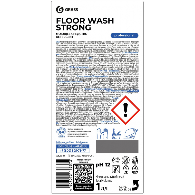 Щелочное низкопенное средство для машинной и ручной мойки водостойких полов Grass Floor Wash Strong 1.2 кг Назначение: концентрированное щелочное средство особо сильных загрязнений предназначено для мытья синтетических, виниловых и полимерных покрытий, поверхностей из линолеума, кафеля, асфальта, бетона, облицовочной плитки. Удаляет даже въевшиеся бытовые и уличные загрязнения, в том числе масложировые и органические. Используется в бытовых и подсобных помещениях, на объектах социальной и общественной сферы. Обладает приятным ароматом. Способ применения: Применяется для машинной и ручной уборки поверхностей.Генеральная мойка сильнозагрязненных поверхностей (ручная и механизированная):Используется в виде водного раствора в пропорции 1:50-1:25 = 2-4 концентрации (20-40 мл средства на 1 л воды). Нанеcти раствор ручным или механизированным способом на загрязненную поверхность, выдержать 2-5 минут, протереть щеткой и промыть водой.Очистка слабо- и среднезагрязненных поверхностей (ручная и механизированная):Используется в виде водного раствора в пропорции 1:200-1:100 = 0,5-1 концентрации (5-10 мл средства на 1 л воды). Нанеcти раствор ручным или механизированным способом на загрязненную поверхность. Состав. Вода очищенная, ПАВ, активные компоненты, комплексообразователи, краситель, ароматизатор. Срок годности: 2 года с момента производства (при соблюдении условий хранения рекомендованных производителем)