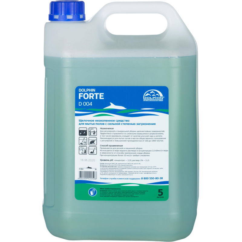 Щелочное низкопенное средство для генеральной и регулярной мойки полов с сильной степенью загрязнения Dolphin Forte (D 004) 5л Назначение: щелочное низкопенное концентрированное средство для регулярной и генеральной уборки полов с сильной степенью загрязнения. Эффективно справляется со сложными въевшимися загрязнениями, в том числе жировыми, очищает от налетов уличной гари и копоти. Рекомендуется для мытья полов в местах общественного пользования с регулярной и повышенной проходимостью от 100 до 1000 чел./час, а также для очистки фасадов зданий. Способ применения: Применяется для машинной уборки. Используется в виде водного раствора в концентрации 0,25-3 раствор (2,5-30 мл / 1 л воды) в зависимости от способа применения и степени загрязнения. При концентрации более 1 раствора (10 мл / 1 л воды) требует смывания. Для генеральной уборки применять методом замачивания на 10-15 мин. в концентрации 30 мл / 1 л воды = 3 раствор, с последующей обработкой роторной машиной или ручными щетками. После очистки требуется повторная промывка водой. Средство подходит для ручной мойки полов. Состав: анионные ПАВ 0-5, неионогенные ПАВ 0-5, мыло 0-5, фосфонаты 0-5, соли НТА 0-5, отдушка, краситель. Срок годности: 2 года с момента производства (при соблюдении условий хранения рекомендованных производителем)