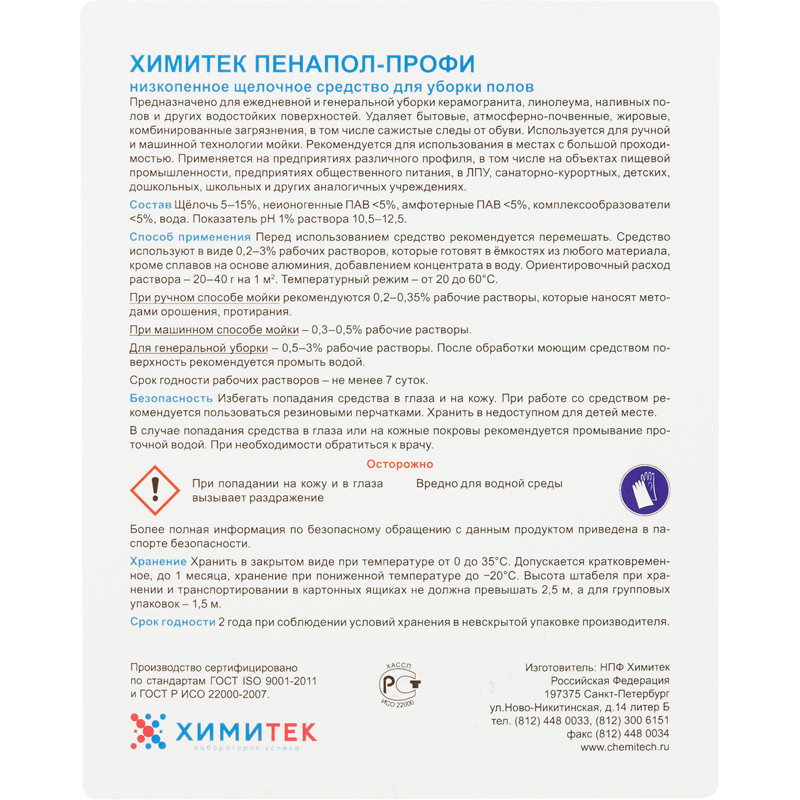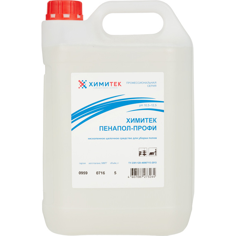 Концентрированное жидкое низкопенное щелочное средство для уборки полов Химитек Пенапол-ПрофиНазначение: Предназначено для ежедневной и генеральной уборки керамогранита, линолеума, наливных полов и других водостойких поверхностей. Удаляет бытовые, атмосферно-почвенные, жировые, комбинированные загрязнения, в том числе сажистые следы от обуви. Используется для ручной и машинной технологии мойки. Рекомендуется для использования в местах с большой проходимостью. Применяется на предприятиях различного профиля, в том числе на объектах пищевой промышленности, предприятиях общественного питания, в ЛПУ, санаторно-курортных, детских, дошкольных, школьных и других аналогичных учреждениях.Способ применения: Перед использованием средство рекомендуется перемешать. Средство используют в виде 0,2%-3% рабочих растворов, которые готовят в емкостях из любого материала, кроме сплавов на основе алюминия, добавлением концентрата в воду. Ориентировочный расход раствора - 20-40 г на 1 м. Температурный режим - от 20°C до 60°C.При ручном способе мойки рекомендуются 0,2%-0,35% рабочие растворы, которые наносят методами орошения, протирания.При машинном способе мойки - 0,3%-0,5% рабочие растворы.Для генеральной уборки - 0,5%-3% рабочие растворы. После обработки моющим средством поверхность рекомендуется промыть водой.Срок годности рабочих растворов - не менее 7 суток.Меры предосторожности: Избегать попадания средства в глаза и на кожу. При работе со средством рекомендуется пользоваться резиновыми перчатками. Хранить в недоступном для детей месте.В случае попадания средства в глаза или на кожные покровы рекомендуется промывание проточной водой. При необходимости обратиться к врачу. Условия хранения: Хранить в закрытом виде при температуре от 0°C до +35°C.Состав: Вода 30%, щелочь 5%, но <15%, неионогенные ПАВ <5%, амфотерные ПАВ <5%, комплексообразователи <5%.Срок годности: 2 года при соблюдении условий хранения в невскрытой упаковке производителя.