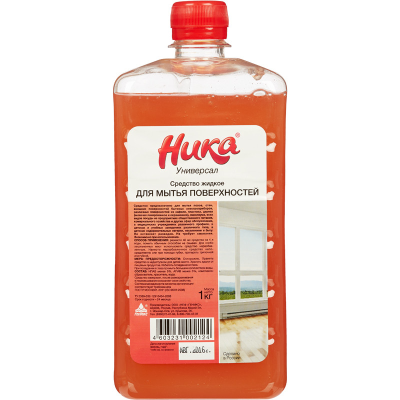 Средство жидкое для мытья поверхностей 'Ника-Универсал'Назначение:Средство предназначено для мытья полов, стен и различных поверхностей из кафеля, пластика, дерева, линолеума.Область применения:Разрешено на предприятиях общественного питания, пищевой промышленности, в лечебно-профилактических, детских школьных и дошкольных учреждениях, на объектах сферы обслуживания и в быту населением.Способ применения: развести 40 мл средства на 4 л воды, помыть обычным способом не смывая.Меры предосторожности:При попадании в глаза промыть большим количеством воды.Хранить в недоступном для детей месте.Состав: НПАВ 5%, АПАВ 5%, комплексообразователь, краситель, вода.Срок годности: 24 месяца с момента производства (при соблюдении условий хранения рекомендованных производителем).Законодательные и технические документы: