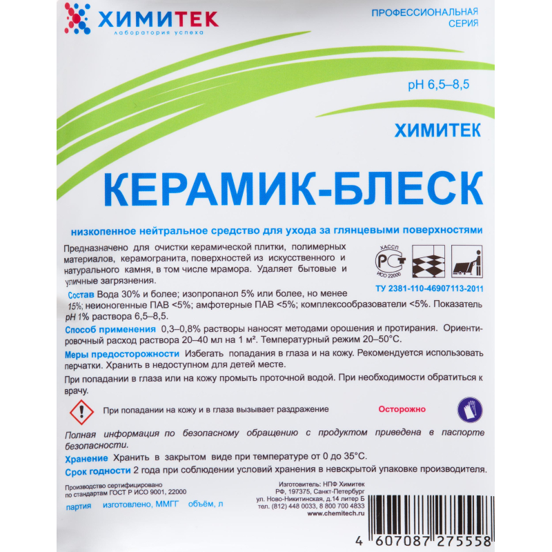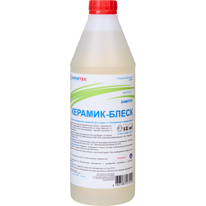 Концентрированное жидкое низкопенное нейтральное средство для ухода за глянцевыми поверхностями Химитек Керамик-БлескНазначение: Предназначено для очистки керамической плитки, полимерных материалов, керамогранита, поверхностей из искусственного и натурального камня, в том числе мрамора. Удаляет бытовые и уличные загрязнения. Улучшает внешний вид блестящей поверхности, не оставляет разводов. Эффективно для ухода за поверхностями из материалов темных тонов. Применяется на предприятиях различного профиля, в том числе на объектах пищевой промышленности, предприятиях общественного питания, в ЛПУ, санаторно-курортных, детских, дошкольных, школьных и других аналогичных учреждениях, в быту.Способ применения: Перед использованием средство рекомендуется перемешать. Средство используют в виде 0,3%-0,8% рабочих растворов, которые готовят в емкостях из любого материала добавлением концентрата в воду. Ориентировочный расход раствора - 20-40 г на 1 м. Температурный режим - от 20°C до 50°C.При ручном способе мойки рекомендуются 0,5%-0,8% рабочие растворы, которые наносят методами орошения и протирания коротковорсовым мопом.При машинном способе мойки рекомендуемая концентрация рабочих растворов 0,3%-0,5%.Срок годности рабочих растворов - не менее 7 суток.Меры предосторожности: Избегать попадания средства в глаза и на кожу. При работе со средством рекомендуется использовать защитные перчатки. Хранить в недоступном для детей месте.В случае попадания средства в глаза или на кожные покровы рекомендуется промывание проточной водой. При необходимости обратиться к врачу. Условия хранения: Хранить в закрытом виде при температуре от 0°C до +35°C.Состав: Вода 30%, изопропанол 5% ,но <15%, неионогенные ПАВ <5%, амфотерные ПАВ <5%, комплексообразователи <5%.Срок годности: 2 года при соблюдении условий хранения в невскрытой упаковке производителя.