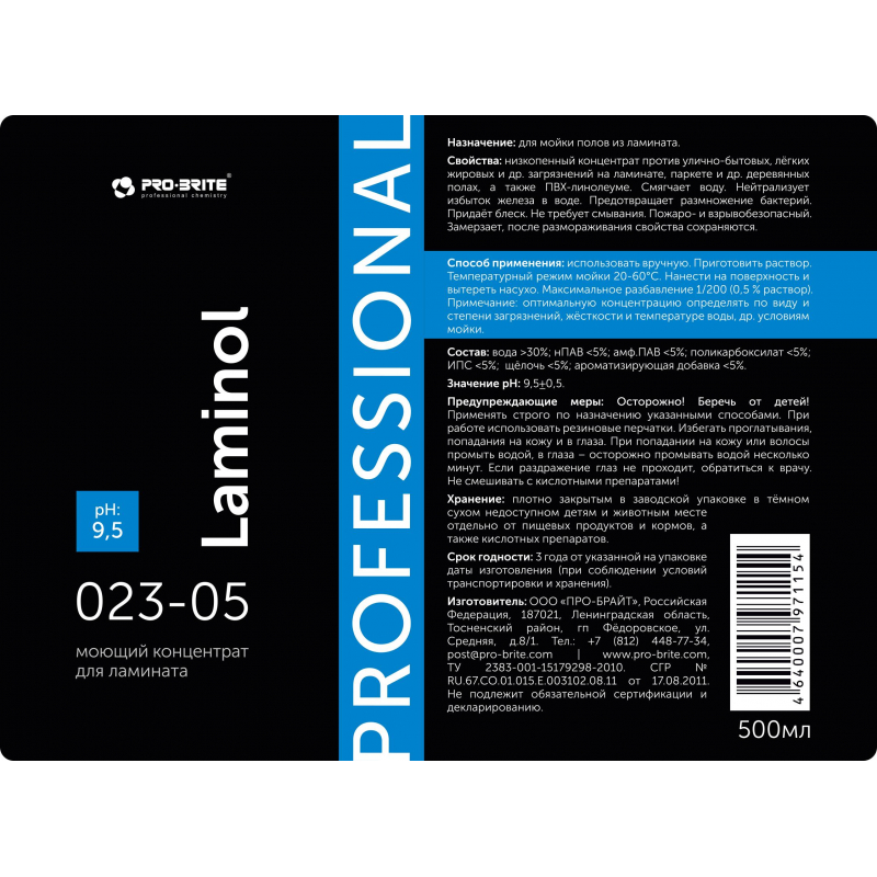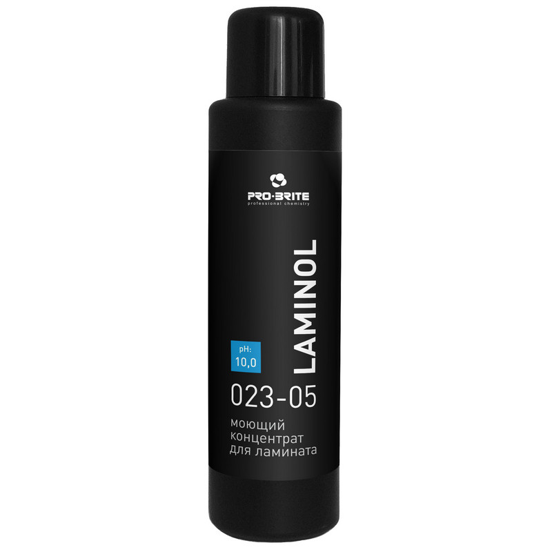 Моющий концентрат для ламината Pro-Bright Laminol 023-05 500 мл Назначение: для мойки полов из ламината. Область применения: торговые и деловые центры, медицинские, образовательные, научные, финансовые, спортивно-оздоровительные, культурно-досуговые и иные учреждения, организации общественного питания, предприятия промышленности, гостиницы и вокзалы, в быту. Свойства: жидкий щелочной низкопенный концентрат против улично-бытовых, легких жировых и др. загрязнений на ламинате, паркете и др. деревянных полах, а также ПВХ-линолеуме. Смягчает воду. Нейтрализует избыток железа в воде. Предотвращает размножение бактерий. Придает блеск. Не требует смывания. Пожаро- и взрывобезопасный. Замерзает, после размораживания возможно помутнение, свойства сохраняются. Способ применения: приготовить раствор. Температурный режим мойки 20-60°С. Использовать вручную. Нанести на поверхность и вытереть насухо. Максимальное разбавление химии для ламината 1:200 (5мл+985мл воды=1л 0,5%-раствора). Примечание: оптимальную концентрацию определять по виду и степени загрязнений, жесткости и температуре воды, типу поверхности и др. условиям мойки. Состав: вода более 30%; нПАВ менее 5%; амф. ПАВ менее 5%; поликарбоксилат менее 5%; ИПС менее 5%; ароматизирующая добавка менее 5%. ароматизирующая добавка менее 5%. Плотность: 1,00+0,05 г/см. кв. при 20°С. Значение pH 1%-раствора: 9,5+0,5. Меры предосторожности. Осторожно! Беречь от детей! Применять строго по назначению указанными способами. При работе использовать резиновые перчатки. Избегать проглатывания, попадания на кожу и в глаза. При попадании на кожу или в глаза промыть водой, при необходимости обратиться к врачу. Не смешивать с кислотными препаратами! Хранение: средство для ламината хранить плотно закрытым в заводской упаковке в темном сухом недоступном детям и животным месте отдельно от пищевых продуктов и кормов, а также кислотных препаратов. Срок годности: 3 года от даты изготовления (при соблюдении условий транспортировки и хранения).
