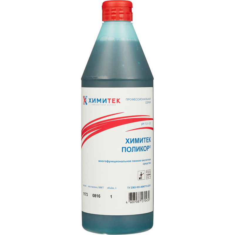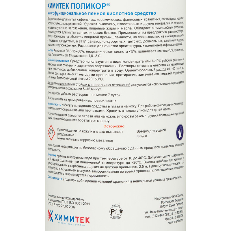 Многофункциональное концентрированное жидкое пенное кислотное средство Химитек ПоликорНазначение: Предназначено для мытья кафельных, керамических, фаянсовых, гранитных, полимерных и других кислотостойких поверхностей. Удаляет ржавчину, известковые и другие минеральные отложения, бытовые и уличные загрязнения, пищевые жиры и масла. Обладает антимикробным эффектом. Рекомендуется для мытья сантехнических блоков. Применяется на предприятиях различного профиля, в том числе на объектах пищевой промышленности, на поверхностях, не имеющих контакта с пищевыми продуктами, в ЛПУ, санаторно-курортных, детских, дошкольных, школьных и других аналогичных учреждениях. Разрешено для очистки архитектурных памятников и фасадов зданий.Способ применения: Средство используется в виде концентрата или 1%-10% рабочих растворов в зависимости от степени и характера загрязнений. Растворы готовят в емкостях из нержавеющей стали, пластмассы добавлением концентрата в воду. Ориентировочный расход 40-100 г на 1 м. Рабочие растворы наносят методами орошения, протирания, замачивания, смывают водой через 3-5 минут. Температурный режим 20°C-50°C.Для удаления ржавчины и стойких минеральных отложений допускается использование средства без разведения, время экспозиции 5-15 минут.Срок годности рабочих растворов - не менее 7 суток.Меры предосторожности: Избегать попадания средства в глаза и на кожу. При работе со средством рекомендуется пользоваться резиновыми перчатками.В случае попадания средства в глаза или на кожные покровы рекомендуется промывание проточной водой. При необходимости обратиться к врачу. Хранить в недоступном для детей месте. Условия хранения: Хранить в закрытом виде при температуре от +10°C до +40°C.Состав: Вода 30%, анионные ПАВ 5%, но <15%, неорганическая кислота<5%, щавелевая кислота <5%, краситель <5%.Срок годности: 2 года при соблюдении условий хранения в невскрытой упаковке производителя.