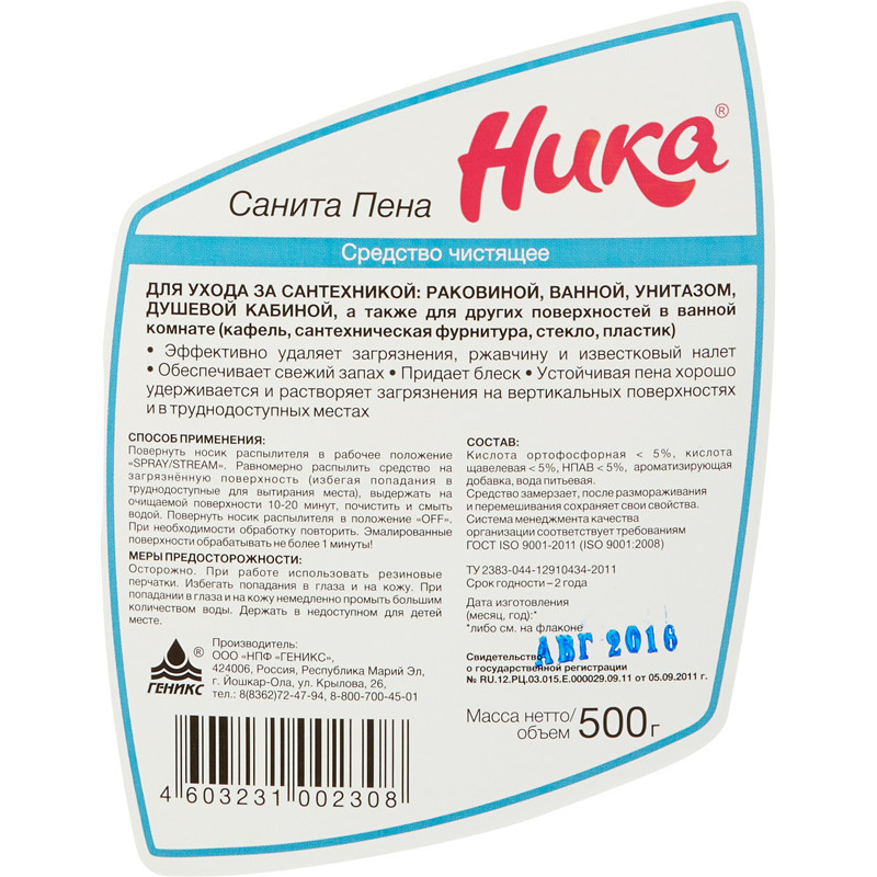 Средство чистящее 'Ника-Санита Пена'Назначение: Средство предназначено для ухода за сантехникой: раковиной, ванной, унитазом, душевой кабиной, а также для других поверхностей в ванной.Область применения: Разрешено на предприятиях общественного питания, пищевой промышленности, в лечебно-профилактических, детских школьных и дошкольных учреждениях, на объектах сферы обслуживания и в быту населением.Способ применения: равномерно распылить средство на загрязненную поверхность, выдержать 10-20 минут, почистить, смыть водой.Меры предосторожности: При попадании в глаза, на кожу немедленно промыть большим количеством воды.Хранить в недоступном для детей месте.Состав: кислота ортофосфорная 5%, кислота щавелевая 5%, НПАВ 5%, ароматизирующая добавка, вода питьевая.Срок годности: 24 месяца. Законодательные и технические документы.