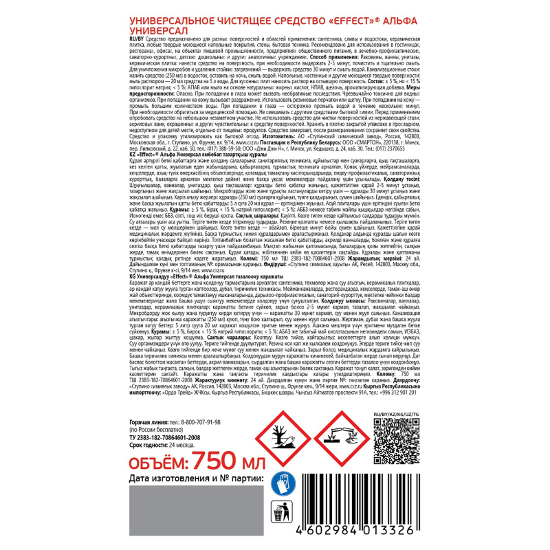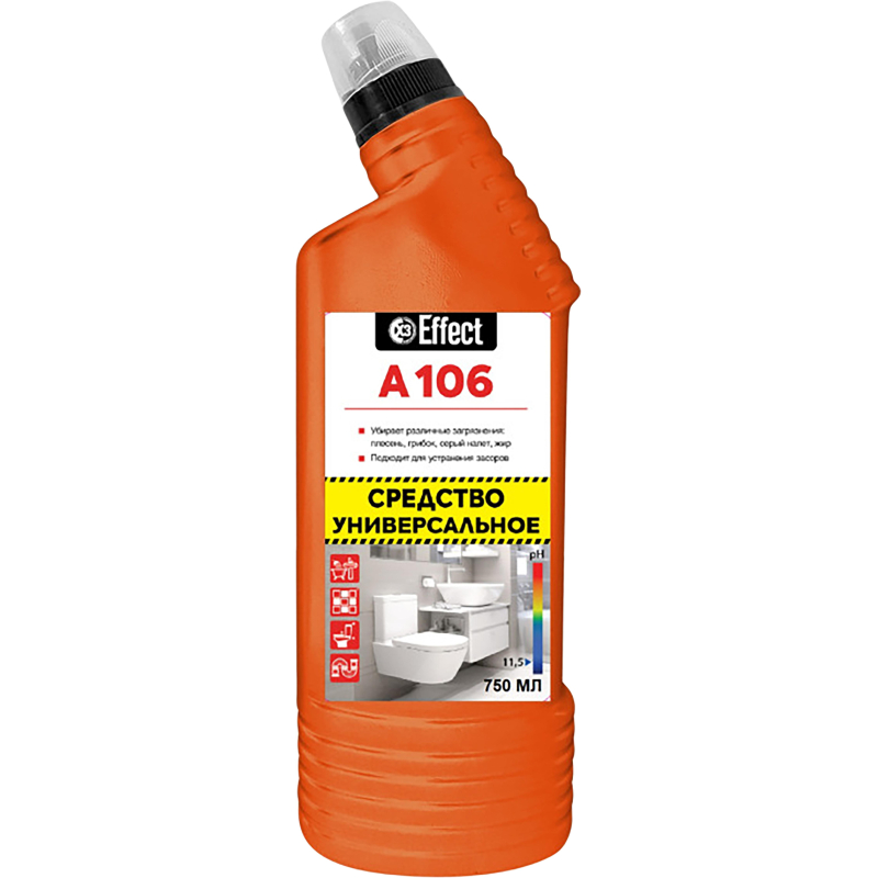 Средство чистящее универсальное для различных загрязнений Effect Alfa 106Назначение: Предназначено для разных поверхностей и областей применения: сантехника, сливы и водостоки, керамическая плитка, любые твердые моющиеся напольные покрытия, стены, бытовая техника. Эффективно устраняет серый налет, плесень, жир, мыльные потеки и другие загрязнения. Обладает антимикробными свойствами.Рекомендовано для использования в гостиницах, ресторанах, офисах, на объектах пищевой промышленности, предприятиях общественного питания, в лечебно-профилактических, санаторно-курортных, детских, дошкольных и других аналогичных учреждениях.Способ применения: Раковины, ванны, унитазы, керамическая плитка: нанести средство на поверхность, при необходимости выдержать 2-5 минут, почистить и тщательно смыть. Для уничтожения микробов и удаления стойких загрязнений выдержать 60 минут.Канализационные стоки: налить в водосток (250 мл), оставить на ночь.Напольные, настенные и другие твердые поверхности: мыть раствором 0,4%.Меры предосторожности: Осторожно! Содержит щелочь. При попадании в глаза и на кожу вызывает раздражение! При попадании на кожу - промыть большим количеством воды! При попадании в глаза - осторожно промыть водой в течение нескольких минут. При необходимости обратиться за медицинской помощью. При работе рекомендуется использовать щетку или резиновые перчатки. Хранить в недоступном для детей месте! Не смешивать с другими веществами. Хранить плотно закрытым в прохладном месте, отдельно от пищевых продуктов. Перед применением рекомендуется опробовать средство на небольшом незаметном участке. Не использовать для чистки поверхностей из нержавеющей стали, акриловых ванн, окрашенных и других чувствительных к средству поверхностей. Средство замерзает, после размораживания сохраняет свои свойства. По истечении срока годности средство и упаковку утилизируют как бытовой отход.Условия хранения: Хранить в сухом прохладном месте. Предохранять от попадания прямых солнечных лучей.Состав: 5%, но <15%: гипохлорит натрия (калия), <5%: АПАВ или мыло на основе натуральных жирных кислот, НПАВ, щелочь, ароматизатор.Срок годности: Срок годности: 18 месяцев.