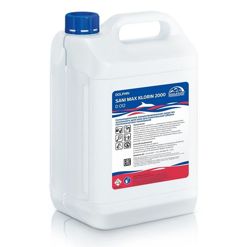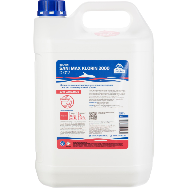 Сильнощелочное концентрированное средство усиленного действия для комплексной уборки сантехнических помещений Dolphin Sani Max Klorin D012 2000 5 л Назначение: для регулярной обработки и отбеливания твердых поверхностей. Подходит для обработки эмалированных, фаянсовых, керамических, пластиковых, хромированных и никелированных поверхностей. Область применения: рекомендуется для применения в помещениях с повышенной влажностью и в зонах бактериального загрязнения: бани, сауны, бассейны, санузлы, душевые. Свойства: средство на основе гипохлорита эффективно уничтожает бактерии, вирусы, грибки, в том числе плесень. Способ применения: применяется для ручной уборки. Используется в виде водного раствора в концентрации 10-20 мл / 1 л в зависимости от вида уборки. Наносится на поверхность щеткой или губкой. Не распылять! Требует смывания. Состав: анионные ПАВ 0-5%, гипохлорит натрия 0-5%, катионные ПАВ 0-5%. ГОСТ/ТУ: ТУ 2383-002-85522504-2011. Плотность: 1,06 г/куб.см. при 20°С. Значение pH 1%-раствора: 11,9. Меры предосторожности (подробная информация см. паспорт безопасности): не разводить в горячей воде. Не смешивать с другими средствами, перед применением прочесть инструкцию. Использовать перчатки, избегать попадания средства в глаза и на кожу. При попадании в глаза тщательно промыть водой, немедленно обратиться к врачу, при попадании на кожу промыть большим количеством воды. Условия хранения: хранить в заводской упаковке при температуре 5-25°С. Не допускать замораживания и попадания прямых солнечных лучей. Хранить в местах недоступных для детей, вдали от пищевых продуктов. Срок годности: 24 месяца (с даты производства).