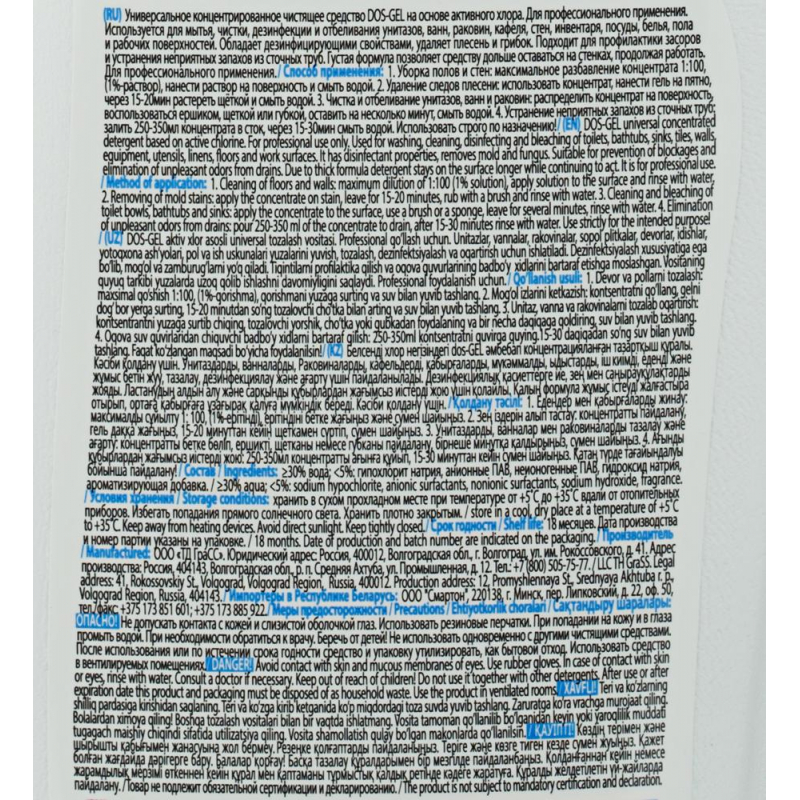 Универсальное концентрированное чистящее средство DOS-GEL на основе активного хлора. Назначение: для профессионального применения. Используется для мытья, чистки, дезинфекции и отбеливания унитазов, ванн, раковин, кафеля, стен, инвентаря, посуды, белья, пола и рабочих поверхностей. Обладает дезинфицирующими свойствами, удаляет плесень и грибок. Густая формула позволяет средству дольше оставаться на стенках, продолжая работать. Состав: 30% вода; <5%: гипохлорит натрия, анионные ПАВ, неионогенные ПАВ, гидроксид натрия, ароматизирующая добавка. Способ применения: рекомендуем использовать при температуре 20-40°С. 1.Чистка и отбеливание унитазов, ванн и раковин: распределить концентрат на поверхность, воспользоваться ершиком, щеткой или губкой, оставить на несколько минут, смыть водой. 2.Уборка полов и стен: максимальное разбавление 1:100, (1 025-раствор), нанести раствор на поверхность и смыть водой. 3.Удаление следов плесени: использовать концентрат, нанести гель на пятно, через 15-20 мин растереть щеткой и смыть водой. Срок годности: 36 мес.