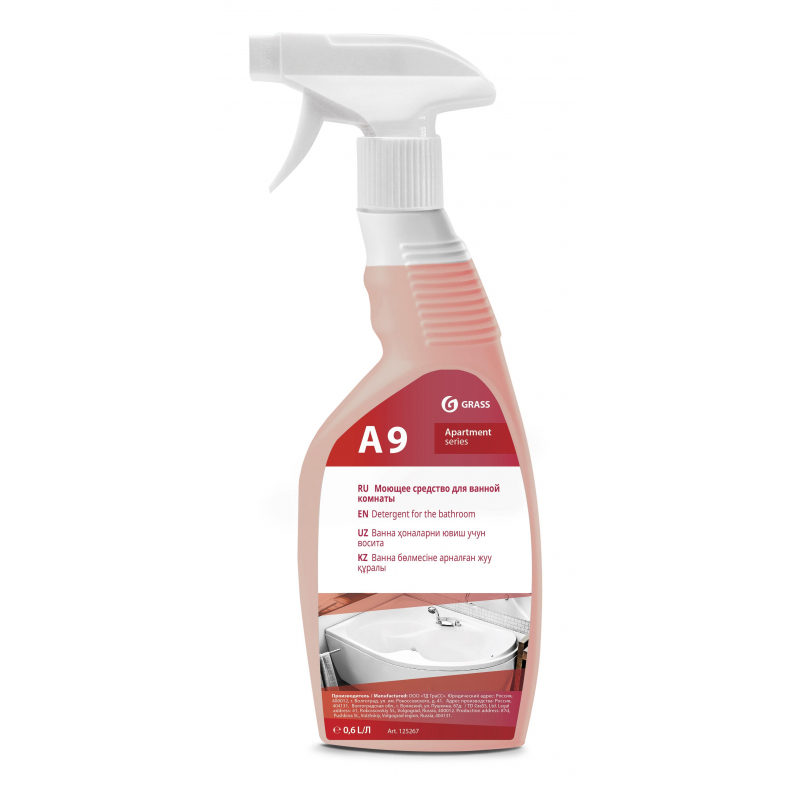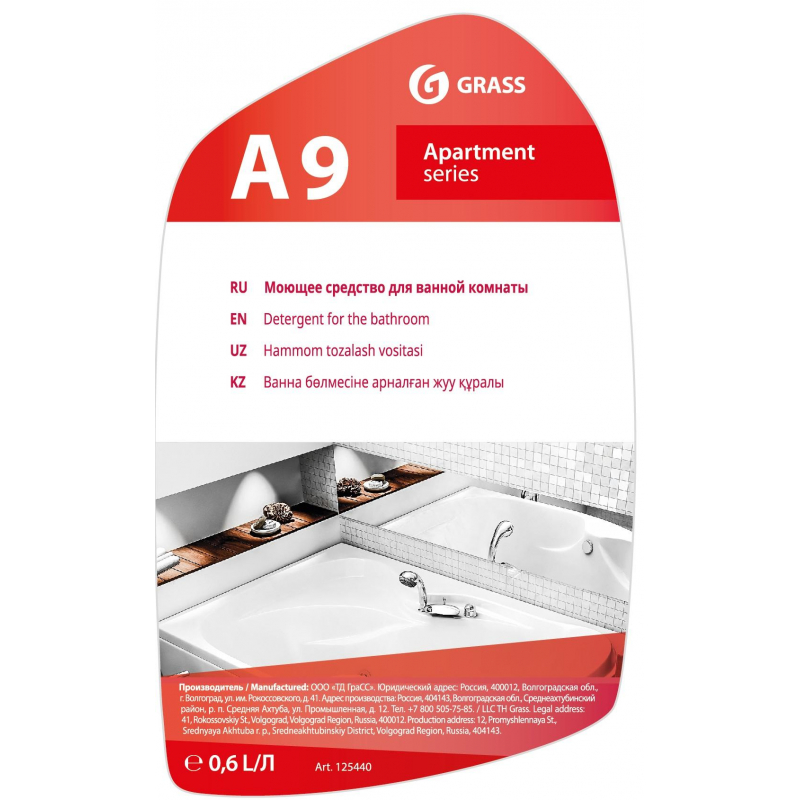 Моющее средство для ванной комнаты Grass Apartment Series A9 600 мл. Назначение: концентрированное кислотное моющее средство для ежедневной уборки, чистки и ухода за акриловыми и эмалированными ваннами, душевыми кабинами, раковинами, кранами, кафельной плиткой, унитазами, писсуарами. Средство удаляет известковый налет, ржавчину. Можно использовать для гостиниц, ресторанов, офисов, на объектах пищевой промышленности, предприятиях общественного питания, в медицинско-профилактических, санаторно-курортных, детских, дошкольных и других аналогичных учреждениях Гелеобразная структура моющего средства обеспечивает экономичный расход. Способ применения: готовый раствор распылить на губку или салфетку и очистить. Потереть влажной салфеткой и отполировать поверхность. Состав: 30% вода очищенная; 5, но <15% лимонная кислота; <5%: неионогенные ПАВ, акриловый сополимер, d-лимонен, ароматизирующая добавка, краситель Срок годности 24 месяца с момента производства (при соблюдении условий хранения рекомендованных производителем). Значение pH 1-% раствора - 2.